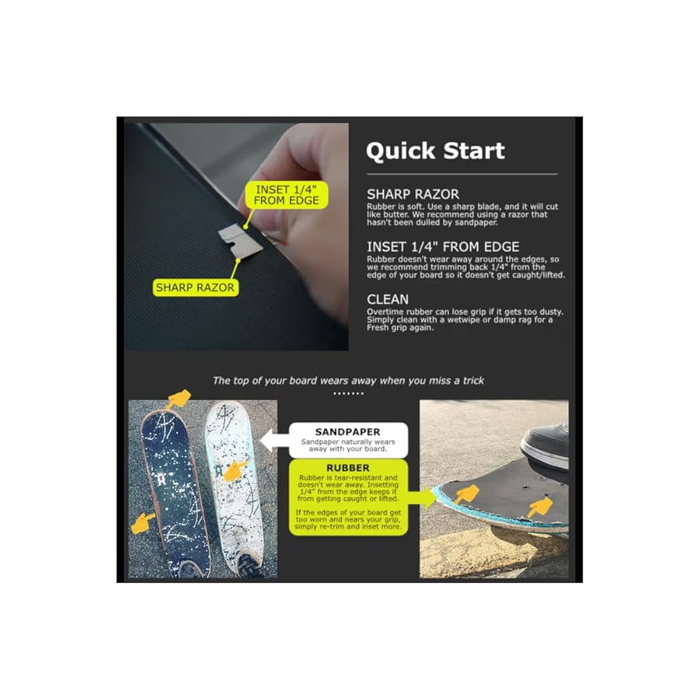 Application Instructions: Rubber is soft. Use a sharp blade (NOT already dulled by sandpaper) to trim. When cutting, make sure to inset 1/4" from the edge of the board. This keeps your grip from hanging over the edge and potentially getting caught and lifted.*If you can, let adhesive set 1 hour or overnight.