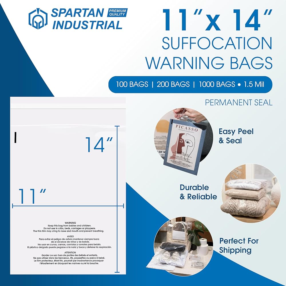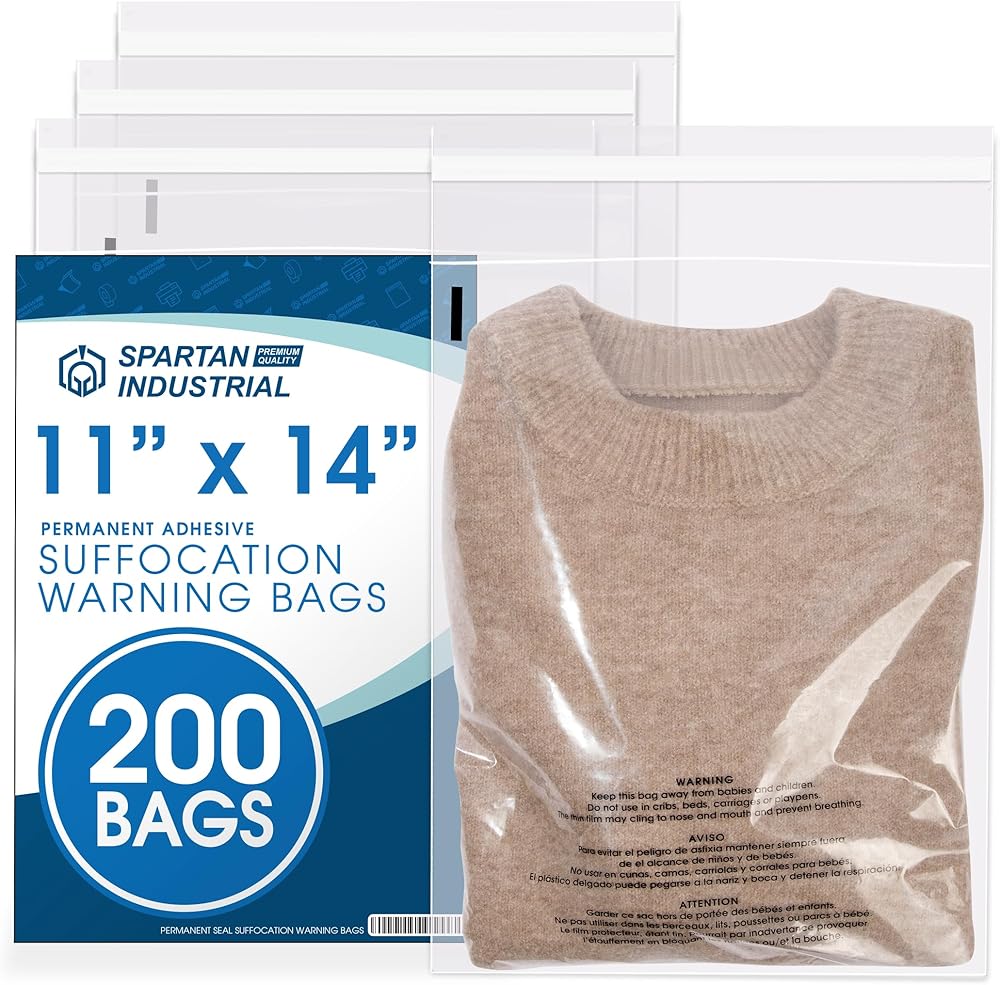 المواصفات: 200 عبوة كبيرة - 11 بوصة × 14 بوصة (العرض × الطول) - الطول لا يشمل غطاء الغراء - أكياس بولي شفافة 1.5 مل من البولي إيثيلين منخفض الكثافة مطبوعة مع تحذير من الاختناق. ميزة الختم الذاتي بمادة لاصقة دائمة.