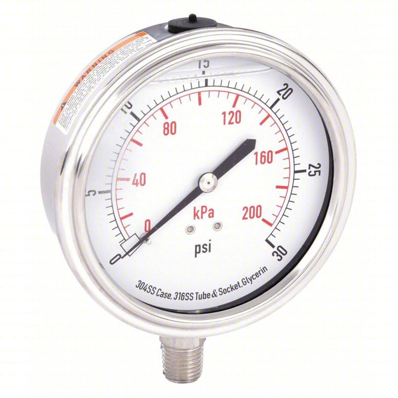This 3 1/2" stainless steel pressure gauge is a reliable and durable tool for monitoring pressure levels. Its sturdy construction and liquid-filled design ensure accurate readings from 0-30 PSI (0-200 kPa). The clear dial with bold markings allows for easy visibility, while the 1/4" NPT bottom mount offers convenient installation. Whether you need to measure pressure in industrial, automotive, or household applications, this gauge provides precise and consistent performance. Its compact size and straightforward design make it a versatile choice for various pressure monitoring needs.