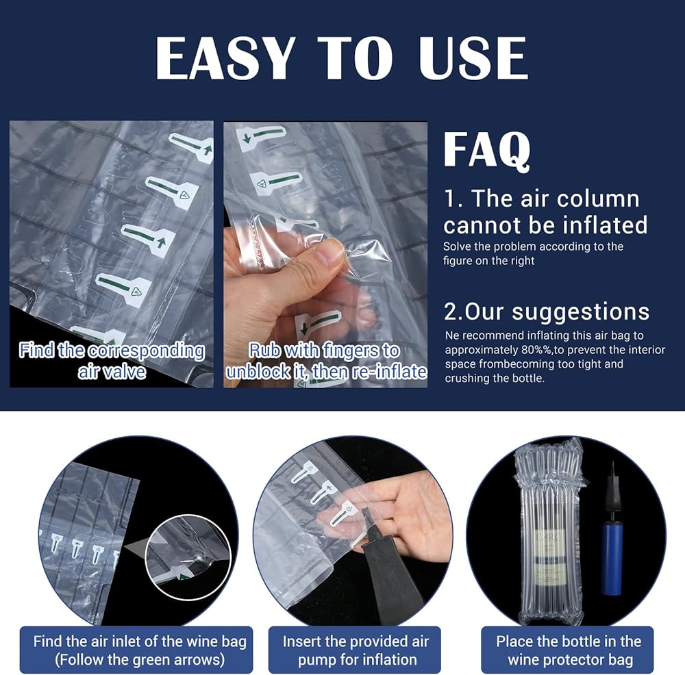 • 【Easy & Quick to Use】Our wine travel protector is user-friendly: simply follow the green arrow to locate the inflation port, attach the included pump to inflate in seconds, then insert your bottle and seal with tape. The wine bottle protectors for air travel are reusable and ideal for hassle-free packing.