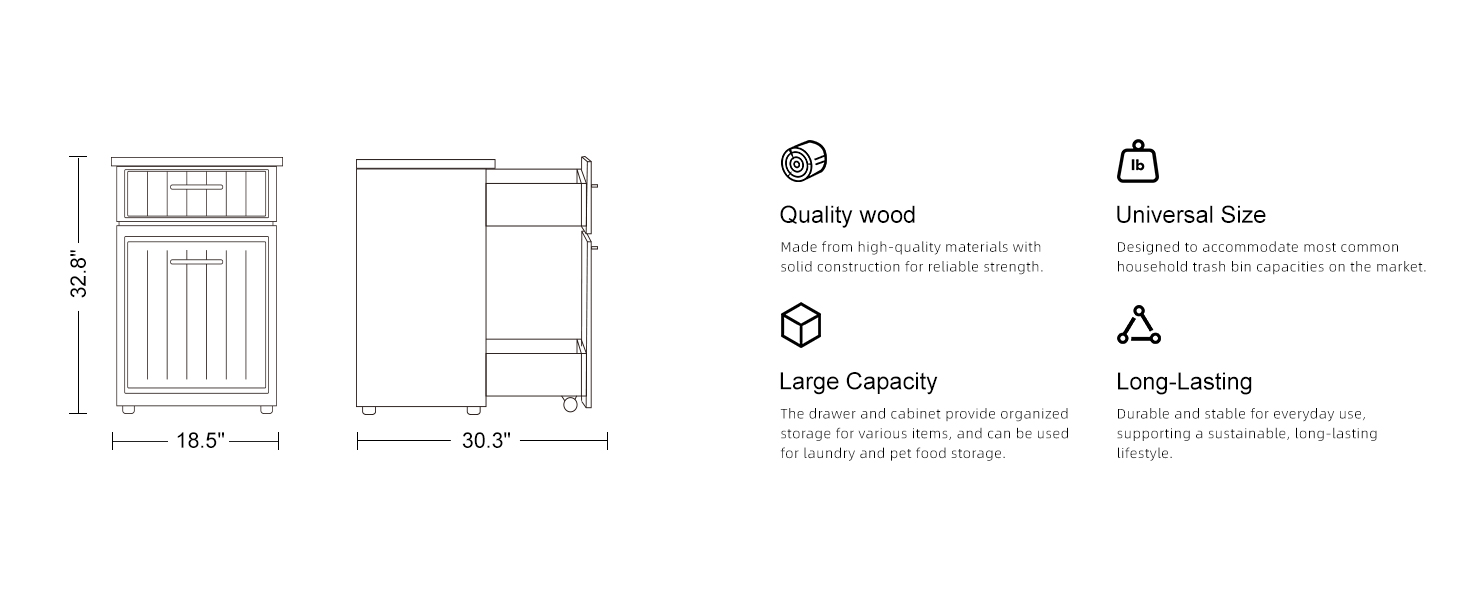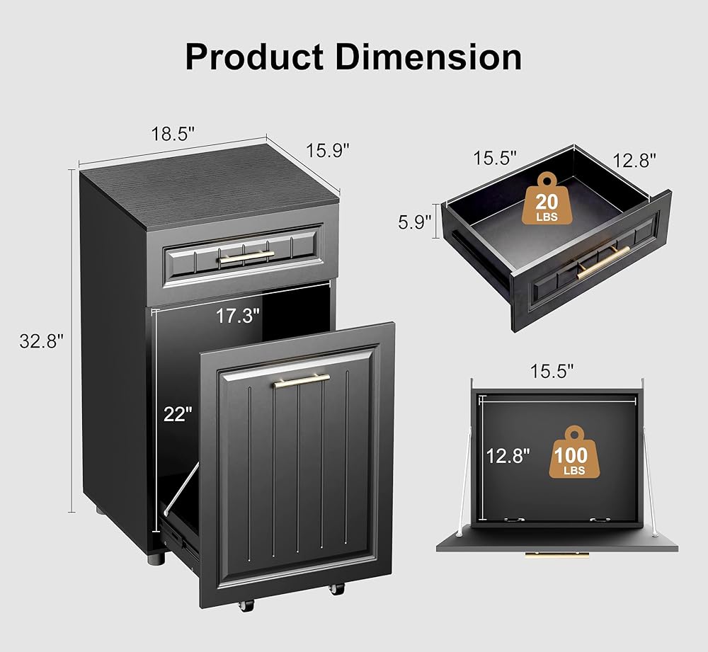 [دليل المقاسات قبل الشراء]: يرجى قياس سلة المهملات قبل الشراء لضمان المقاس المناسب. (صناديق القمامة غير متضمنة). الحجم الإجمالي للخزانة: 18.5 بوصة طول × 15.9 بوصة عرض × 32.9 بوصة ارتفاع. الحجم الداخلي للدرج: 15.5 بوصة طول × 12.8 بوصة عرض × 5.9 بوصة ارتفاع. حجم حجرة القمامة: 15.5 بوصة طول × 12.8 بوصة عرض × 22.4 بوصة ارتفاع.