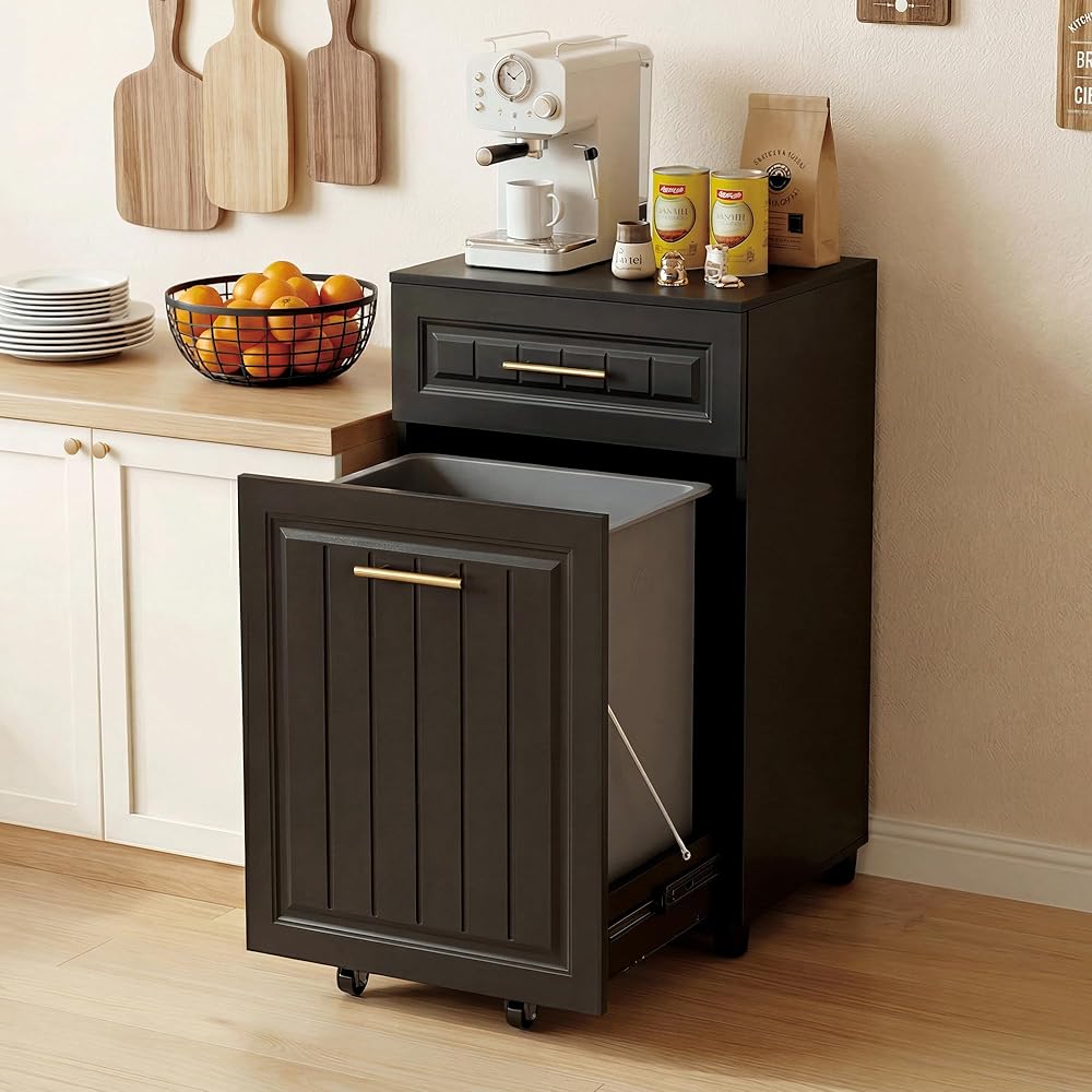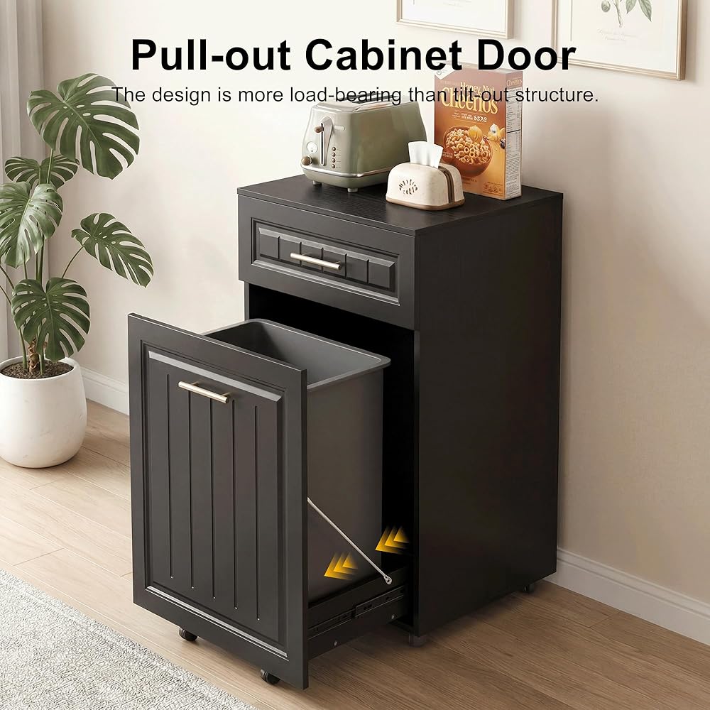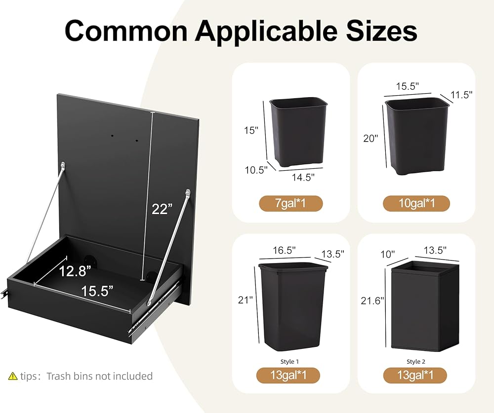 [تصميم محسّن للسحب]: تم تصميم خزانة سلة المهملات القابلة للسحب بقضبان انزلاقية ناعمة وإطار قوي، أكثر تحملاً من الهياكل القابلة للإمالة. يمكن أن تستوعب إما سلة مهملات واحدة سعة 13 جالونًا أو حاوية سعة 10 جالونًا أو حاوية سعة 7 جالونًا لزيادة مساحة التخزين.