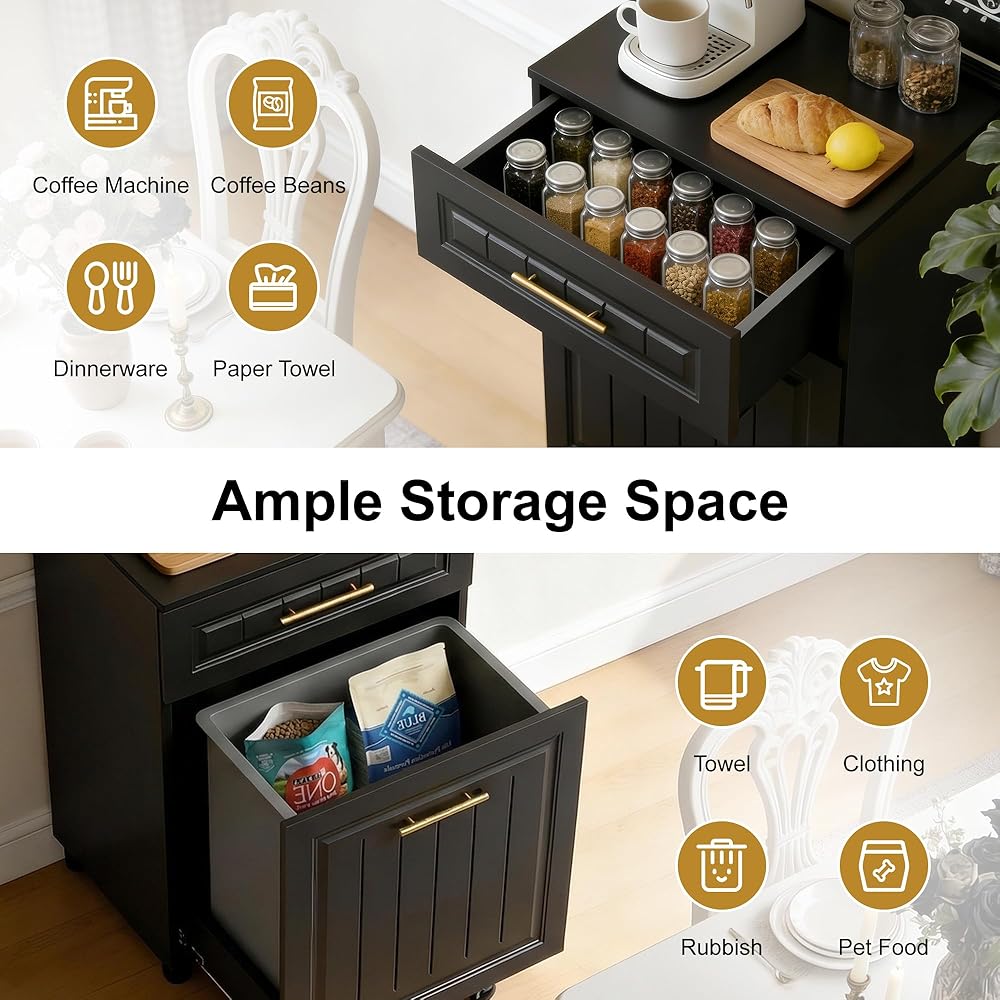 [تخزين متعدد الاستخدامات ووظيفة متعددة الاستخدام]: ليست مجرد حامل سلة المهملات، فهذه الخزانة توفر سطحًا واسعًا للميكروويف وصانع القهوة. درج مدمج للأواني والأكواب والوجبات الخفيفة وما إلى ذلك. خزانة القاعدة لسلال المهملات وصندوق الغسيل وطعام الكلاب وطعام القطط. يمكن استخدامها كجزيرة مطبخ، أو سلة غسيل، أو منظم عام لتناسب احتياجاتك المنزلية.