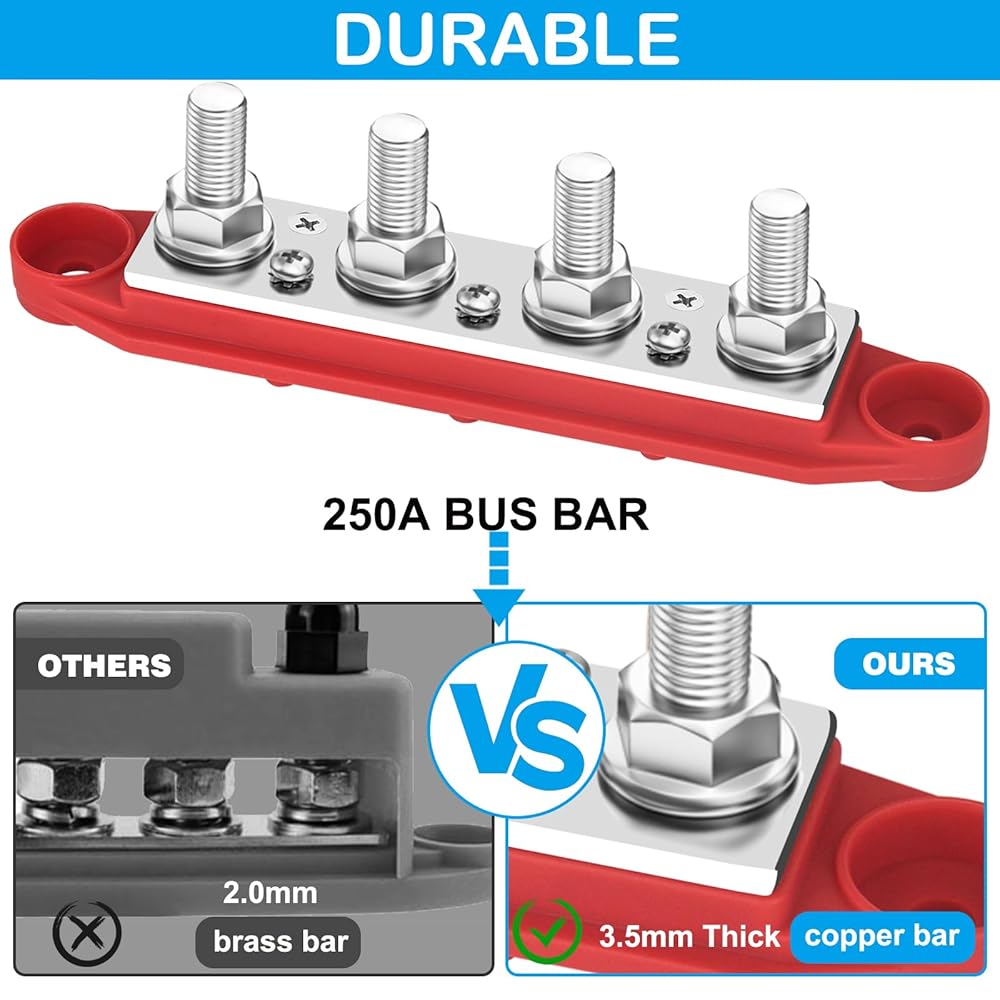 • 【Premium Tinned Copper Plates】 - 50% thicker than standard busbars for better 250A/12V current handling with lower heat generation; Our thickened copper plates, enabling wider cable compatibility and superior conductivity compared to standard bus bars.