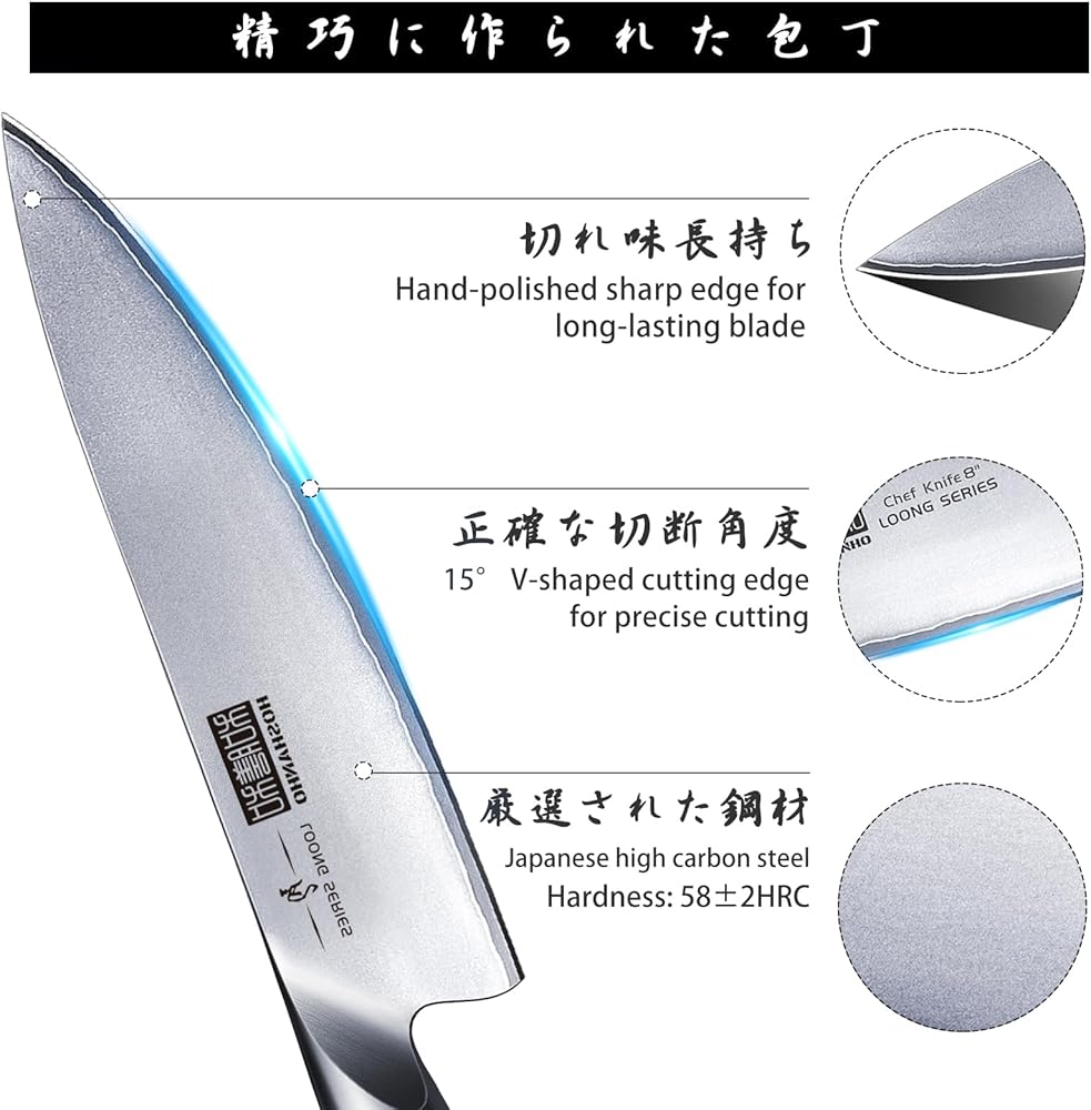 【Forged Japanese Steel】Made of high-quality Japanese 10Cr15CoMoV stainless steel, it has strong resistance to stain and rust; After high-temperature forging, the hardness reaches up to 58 HRC, which ensures that the kitchen knife is durable and remains sharp even in daily use