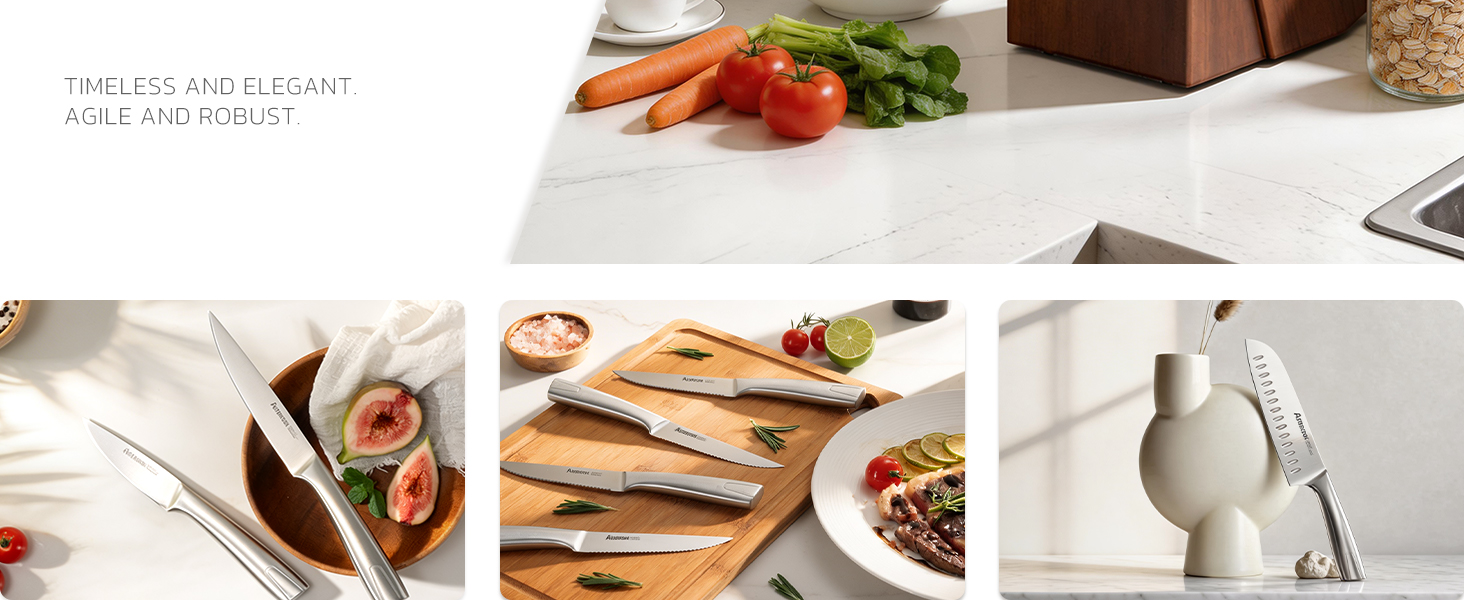 【قم بترقية مطبخك بمجموعة السكاكين الحادة طويلة الأمد 】: تم تصميم مجموعة سكاكين المطبخ هذه بحافة 15 درجة، مما يوفر قطعًا دقيقًا مع كل استخدام. علاوة على ذلك، تحافظ المبراة المدمجة على حافة حادة باستمرار. استثمار واحد، مدى الحياة من الاستخدام.