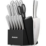 مجموعة سكاكين أستركوك، مجموعة سكاكين المطبخ مع كتلة ومبراة كاملة 15 قطعة من سكاكين الفولاذ المقاوم للصدأ الفاخرة، مجموعة سكاكين آمنة للغسل في غسالة الأطباق مع مقبض مريح مضاد للانزلاق، خشب الجوز
