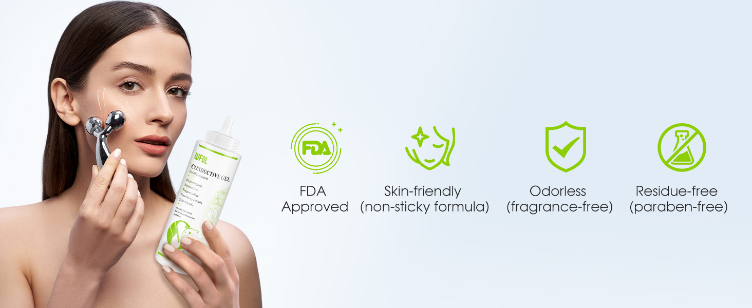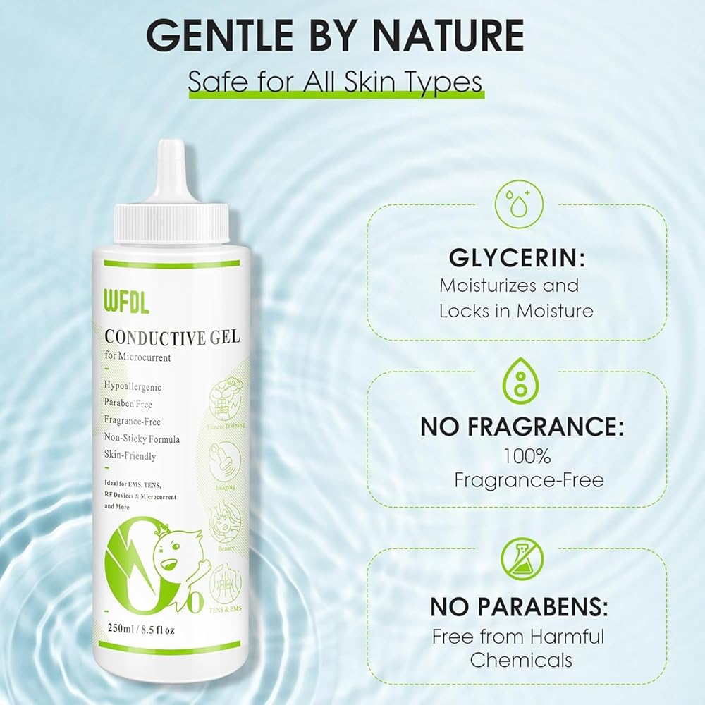 مكونات آمنة للعناية اللطيفة: تركيبة جل موصلة: أكوا (ماء)، كاربوبول، جليسيرول، ترولامين، مينثول. تركيبة الجل الموصلة للكهرباء آمنة ولطيفة، ومناسبة حتى للبشرة الحساسة. خالي من البارابين والكحول والعطور والأصباغ، فهو يقلل من خطر تهيج الجلد أو الحساسية. يمنح كاربوبول الجل ملمسًا ناعمًا وخفيف الوزن وسهل الاستخدام وغير دهني وغير لزج ومريح وسهل التنظيف.