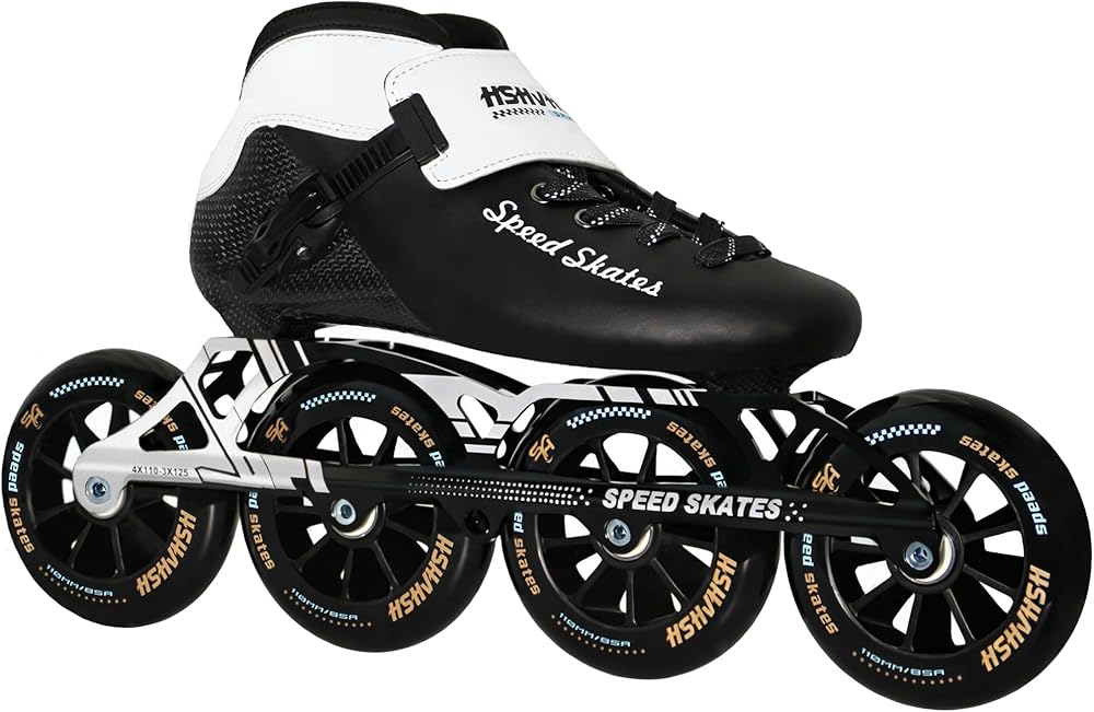 Experience high-speed skating with these expertly crafted speed skates. Featuring a lightweight, durable carbon fiber and PU upper, they deliver strength without extra weight. The 110mm high-elasticity PU wheels, paired with ABEC-11 chrome steel bearings, ensure excellent ground contact, superior speed, and enhanced stability for competition or long-distance skating.Built with a CNC-machined aluminum alloy frame for maximum durability and reduced wobble, they offer a smooth, responsive glide. The 45° adjustable buckle provides a secure, customized fit for better support and safety. Please note: Designed for performance, these skates have a stiff build for speed and may feel firmer than recreational models. For the best fit, please select your regular shoe size.