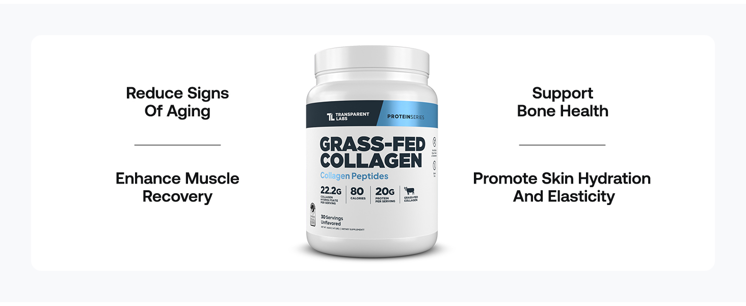 يدعم البشرة والمفاصل والشعر والأظافر: الكولاجين هو البروتين الأكثر وفرة في جسم الإنسان ويلعب دورًا حاسمًا في ترطيب البشرة ومرونتها، وسلامة الأنسجة المشتركة والضامة، وقوة العظام، وصحة الشعر والأظافر.