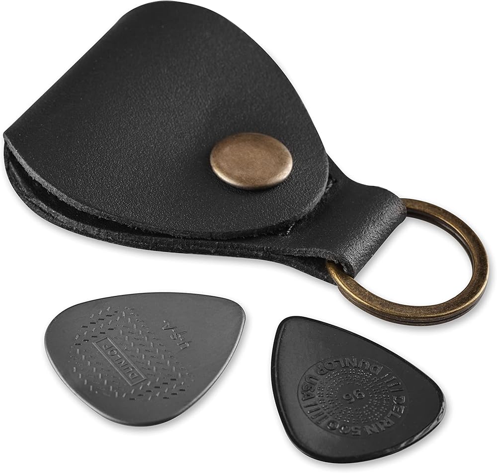 Protect Your Guitar Picks with Ease. This guitar pick holder, mounted on a keychain, offers a simple and affordable solution to keep your picks organized and within reach. Made from thick, full-grain leather, these stunning guitar pick keychains provide a safe storage space for your guitar, bass, or ukulele picks.