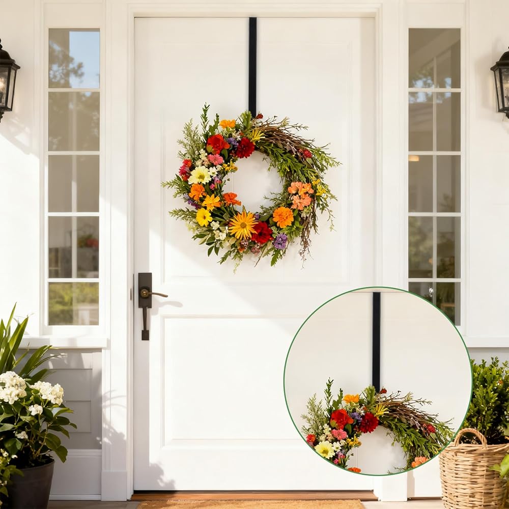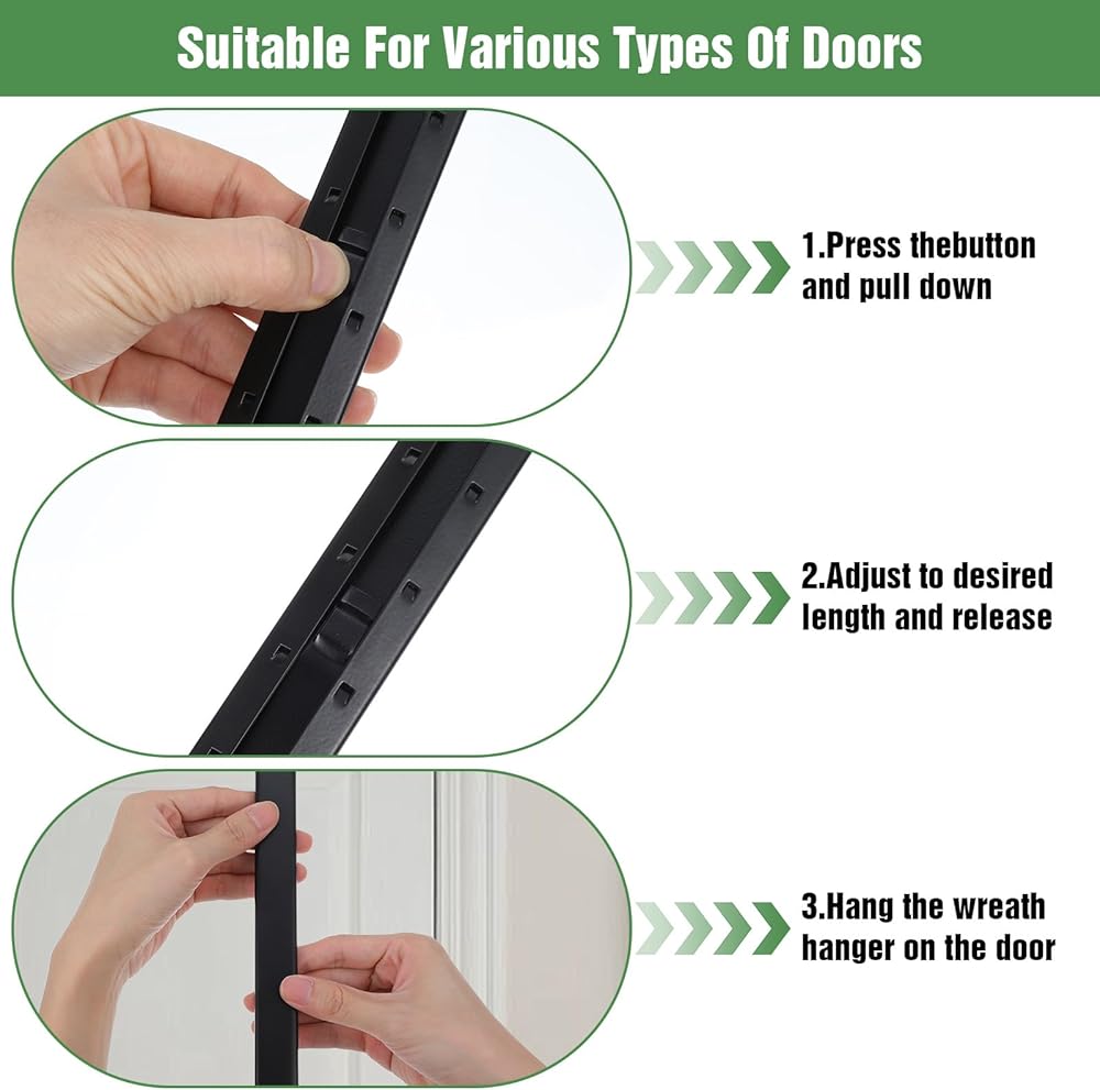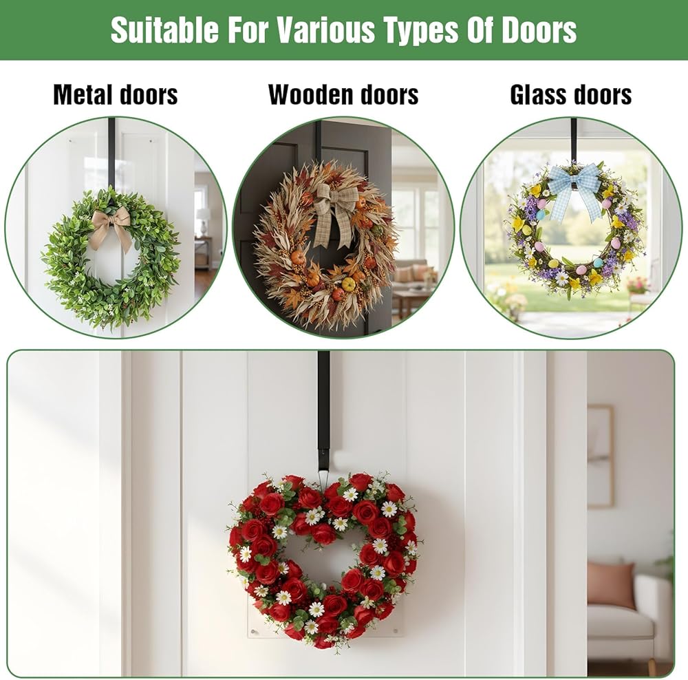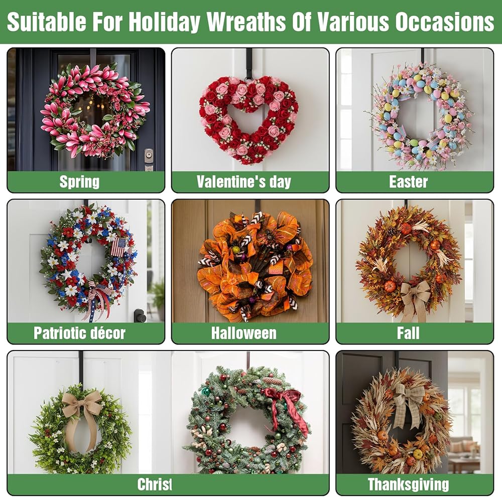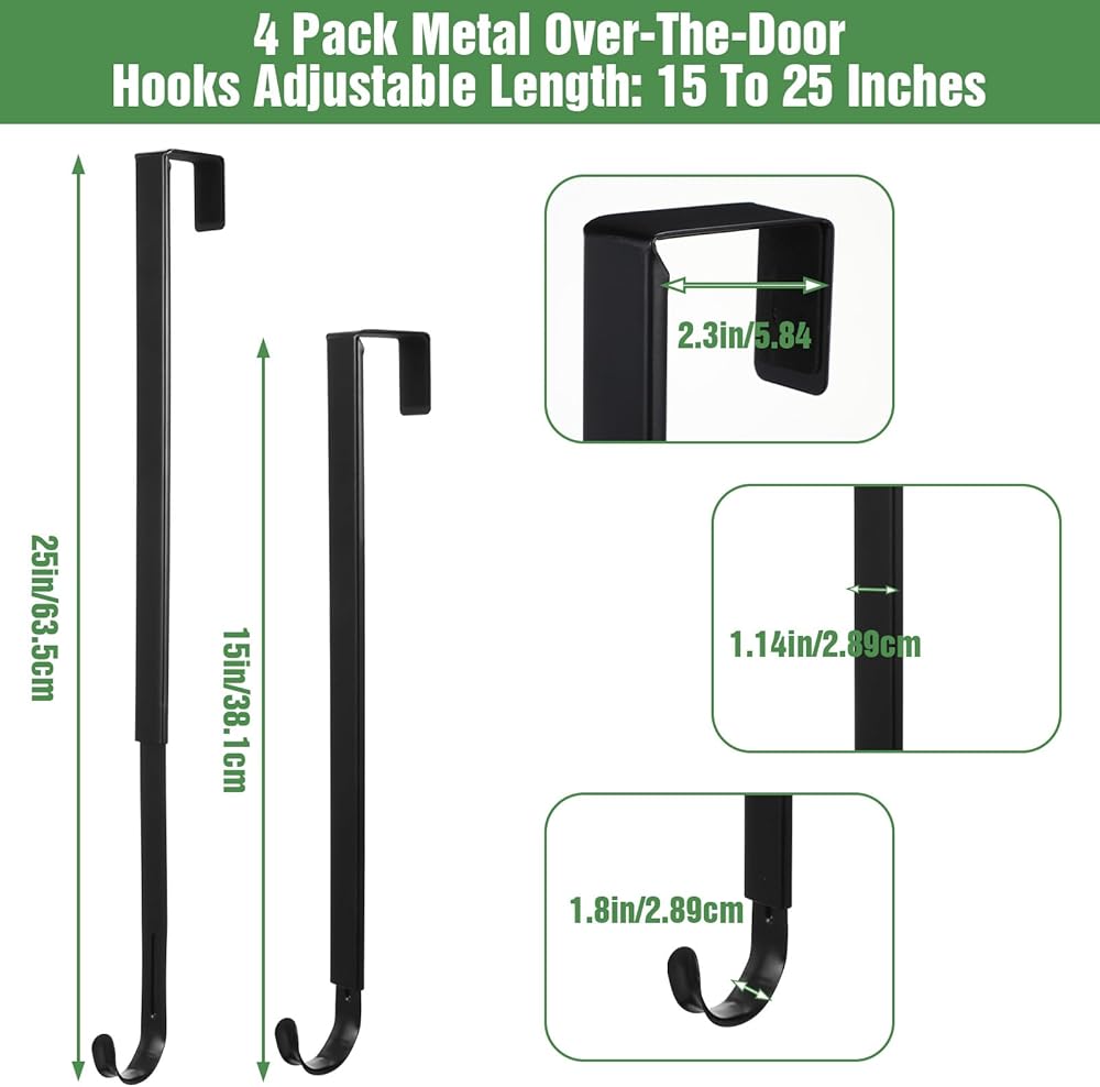 【Adjustable & Ergonomic】Over the door hooks are designed with an adjustable span ranging from 15 inches, making them suitable for various door thicknesses and user heights. These door hanger hooks allow easy access to towels, coats, and seasonal decorations without straining. The over the door towel rack and wreath hanger functions help organize daily essentials efficiently
