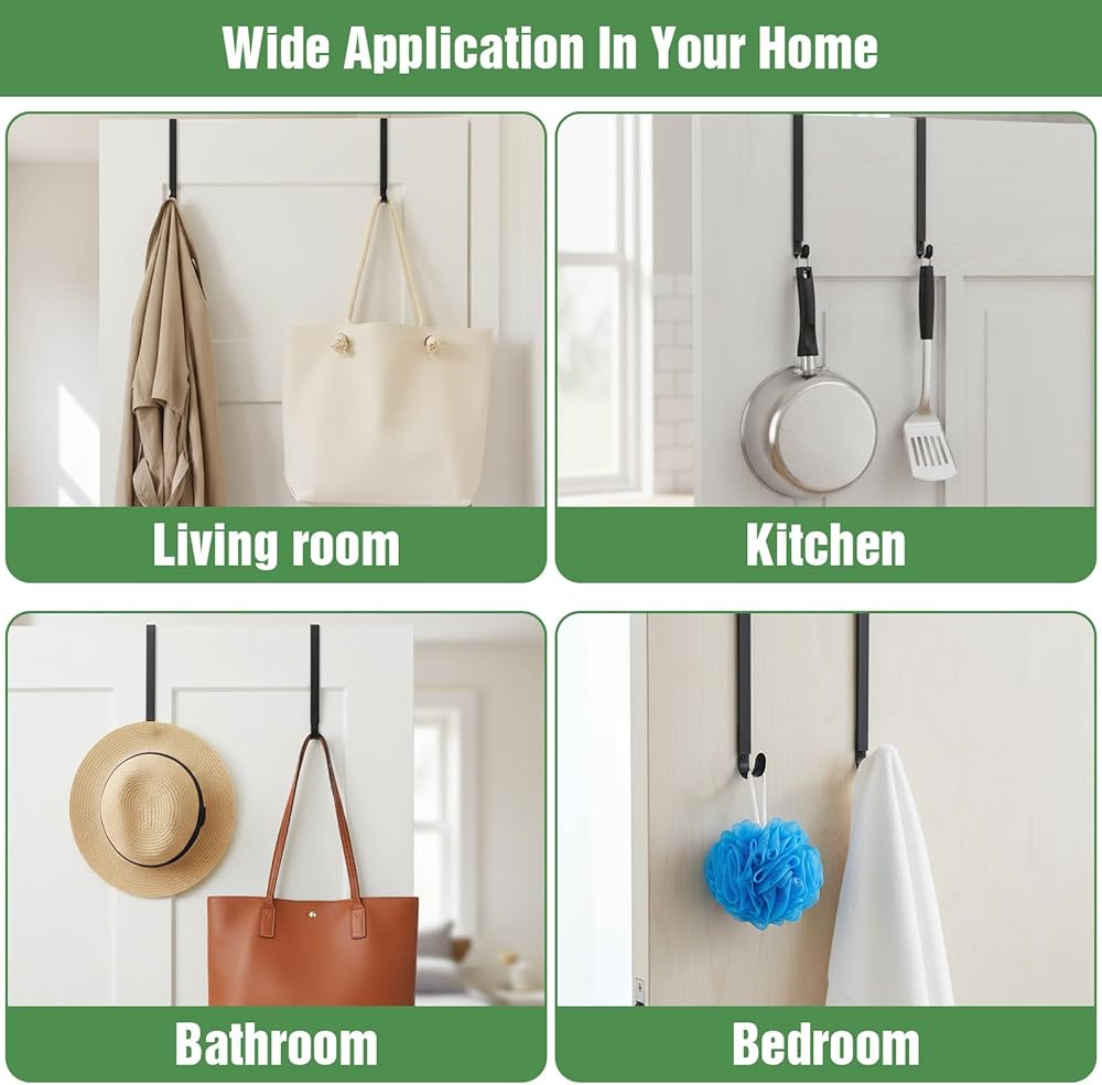 【Multi-Purpose Organizer】Transform any door into a functional storage space with these versatile over the door hooks. They work as a door towel rack, coat hanger, or decorative wreath holder, adapting to seasonal and everyday needs. The lightweight yet strong design allows the over the door organizer to be in closets, bathrooms, entryways, helping you maximize space without clutter. Each set includes four hooks, offering ample hanging points for a variety of household items.