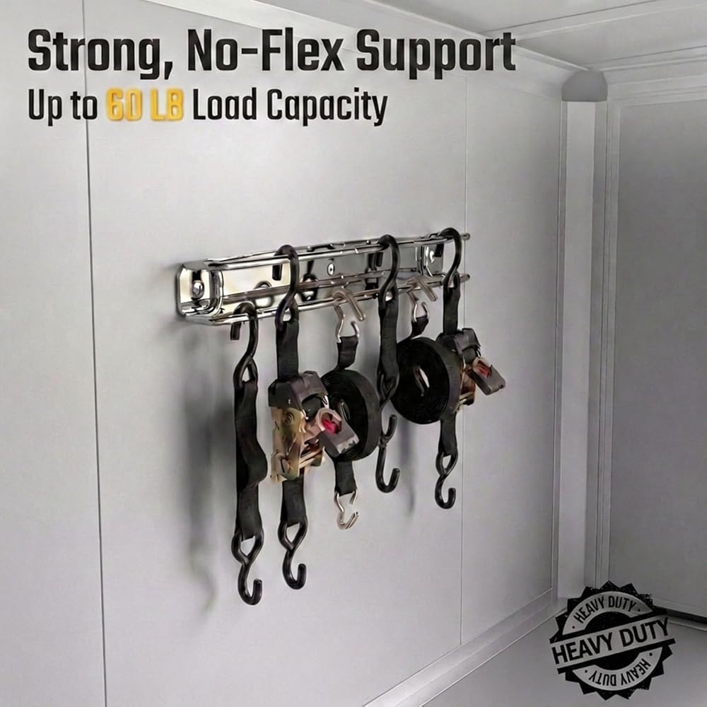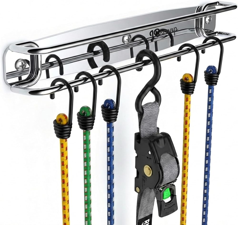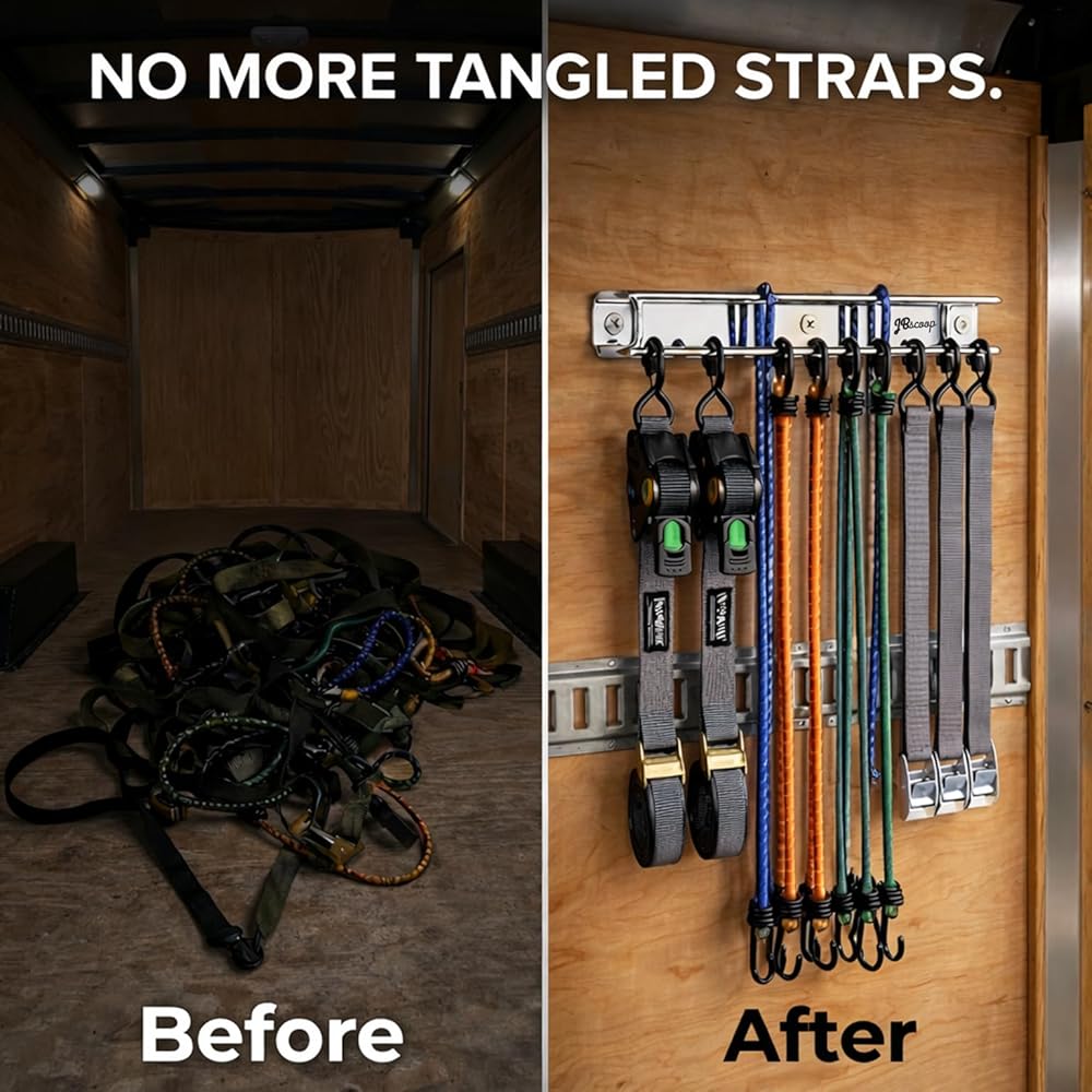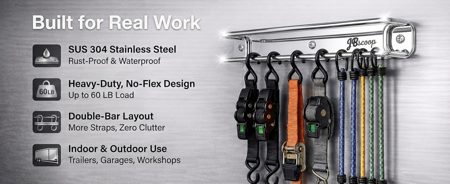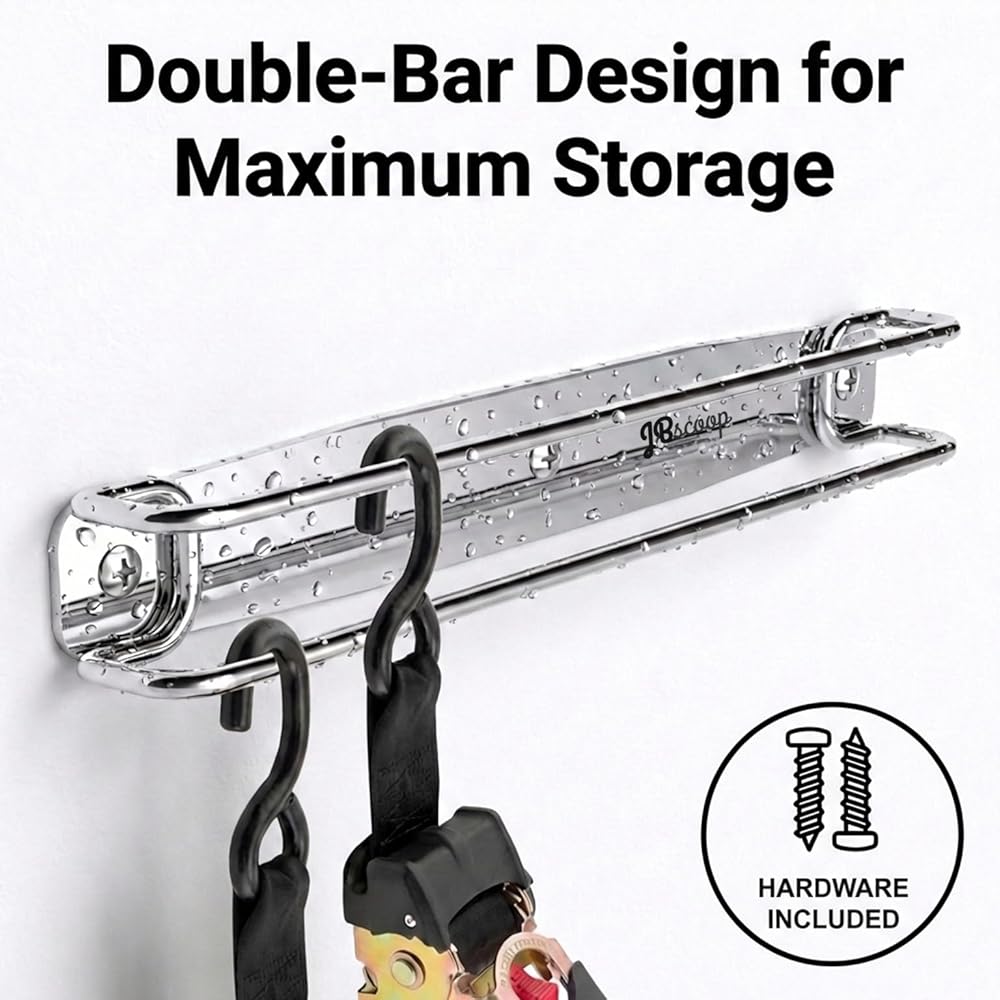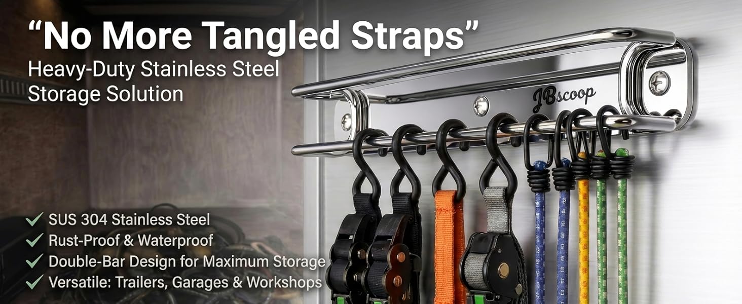 NO MORE TANGLED STRAPS - Eliminate messy piles and knotted cords. The SUS304 double-bar design keeps ratchet straps, cam buckles, and bungee cords neatly separated, visible, and easy to grab—no more digging through bins or drawers.