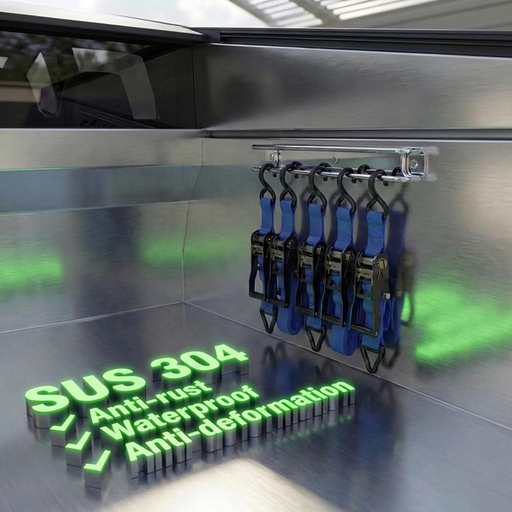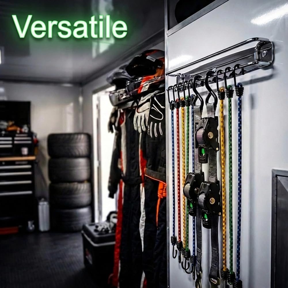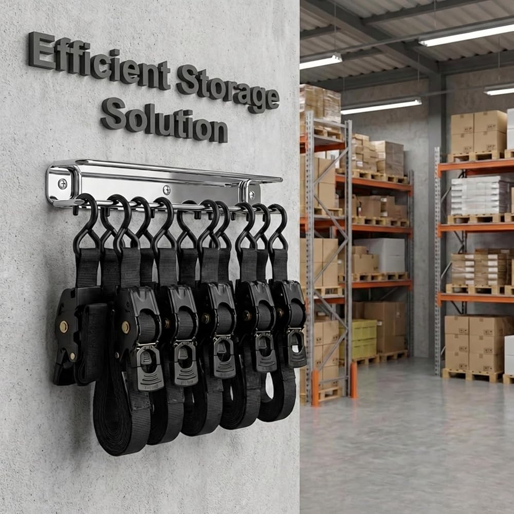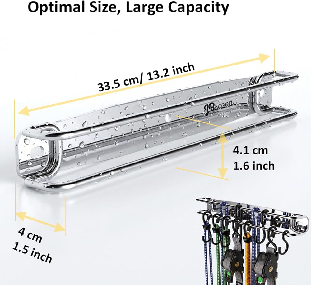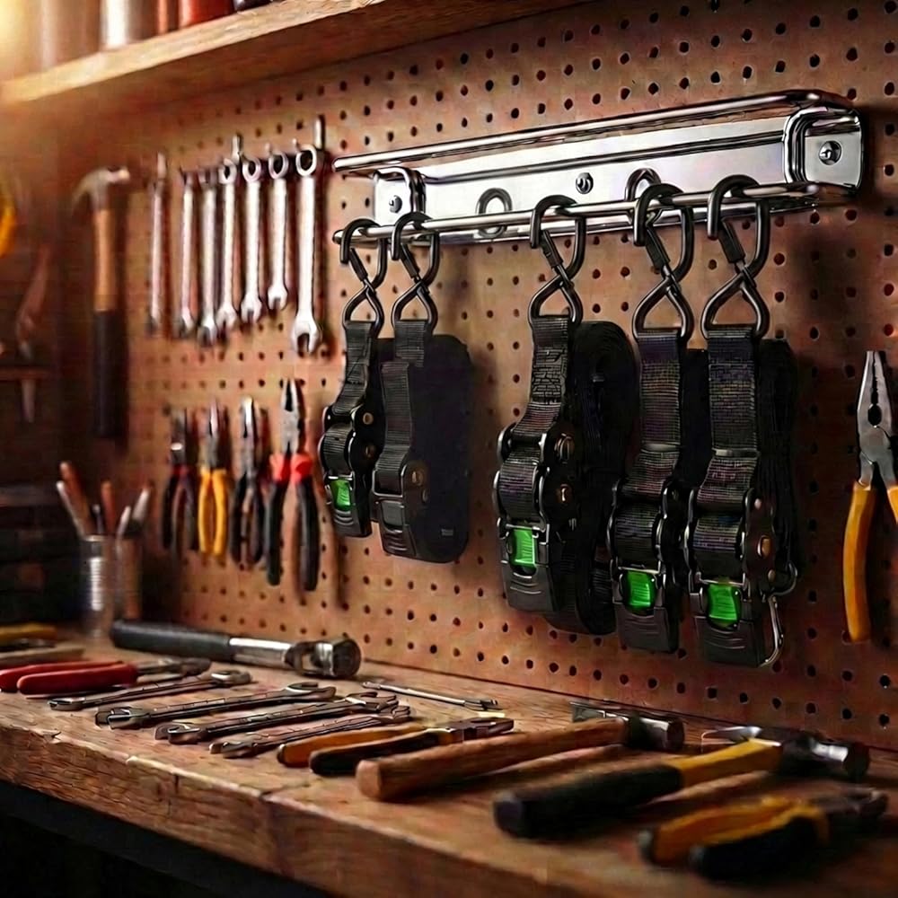 NO MORE TANGLED STRAPS - Eliminate messy piles and knotted cords. The SUS304 double-bar design keeps ratchet straps, cam buckles, and bungee cords neatly separated, visible, and easy to grab—no more digging through bins or drawers.