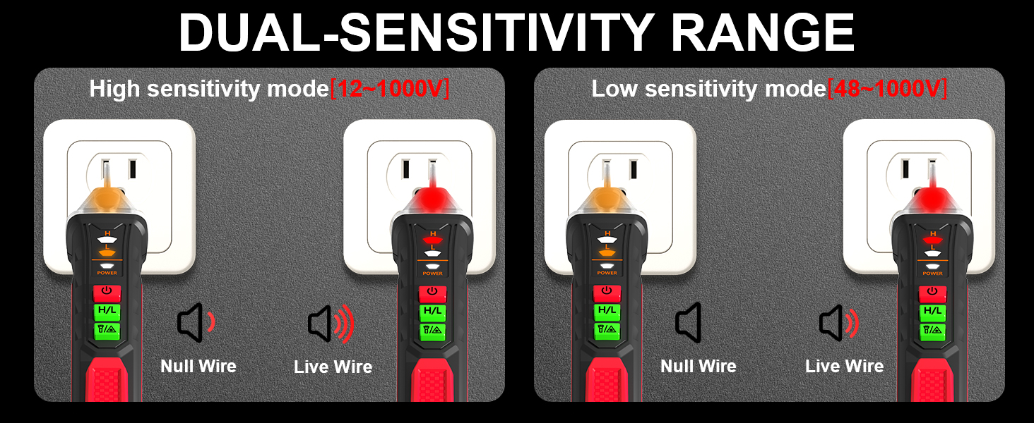• 【أوضاع الحساسية المزدوجة】 يمكن التبديل بسهولة بين الحساسية العالية (12 فولت - 1000 فولت) والمنخفضة (48 فولت - 1000 فولت). مثالي لفحص كل شيء بدءًا من أجراس الأبواب وأجهزة تنظيم الحرارة ذات الجهد المنخفض وحتى المنافذ والأجهزة المنزلية القياسية