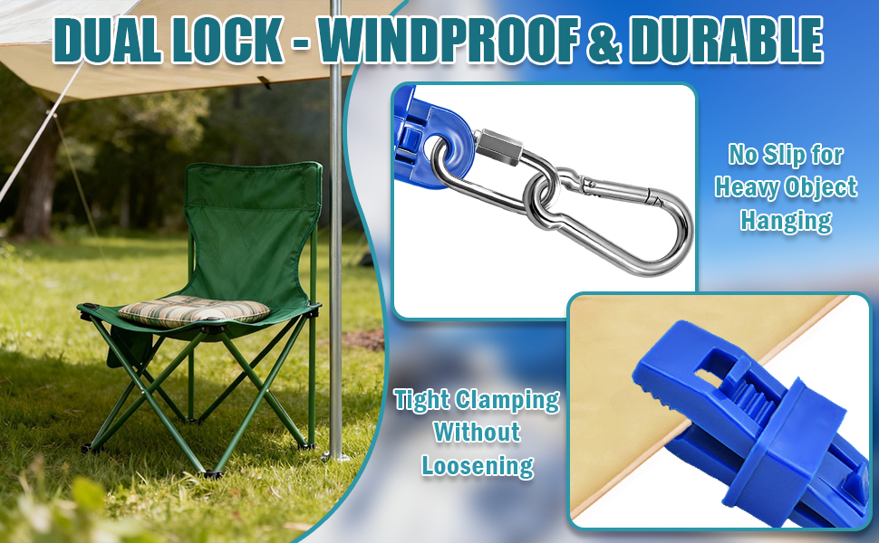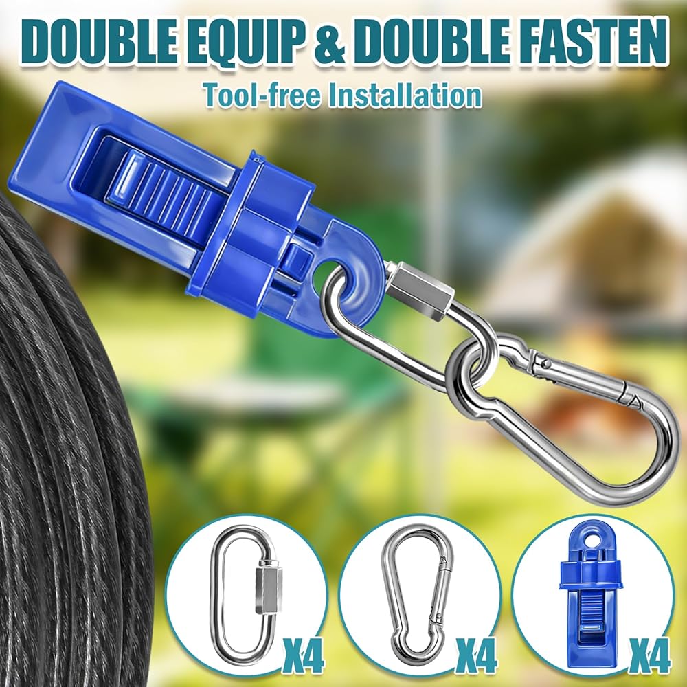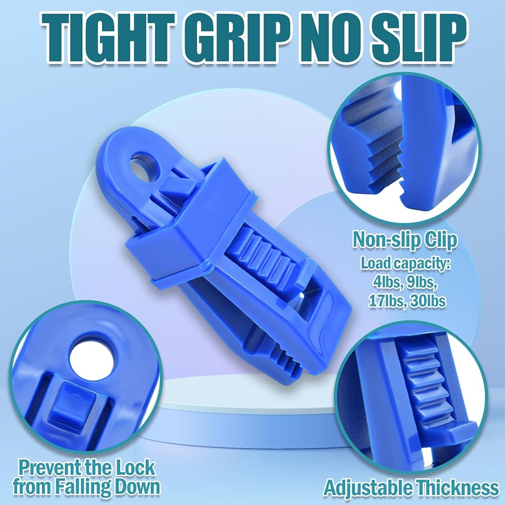 تثبيت قوي: مشابك مسننة مضادة للانزلاق تمسك جميع الأقمشة بإحكام؛ خطاف الشد سهل الشد من أجل تثبيت ثابت ومقاوم للرياح.