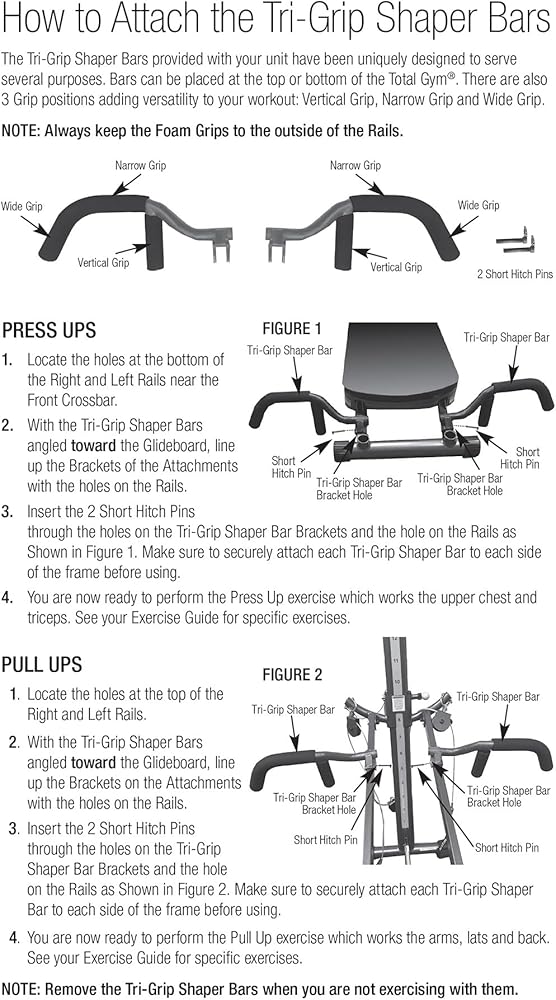 The Total Gym Tri-Grip Shaper Bars offer the ultimate versatility to your Total Gym workout. With 3 unique grip positions – a vertical grip, narrow grip and wide grip, you are able to customize your workout by targeting different muscle groups. Bars easily attach to either the top of your Total Gym for pull-ups to work the arms, lats and back or at the bottom for press-up exercises to work the upper body, chest and triceps. Your workout – your way – with Total Gym. For use on Total Gym FIT, FIT Signature Series, FIT Select Series, XLS, 3000, 2000 & Electra models.