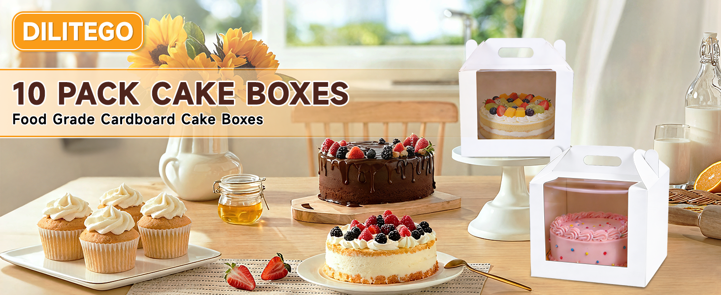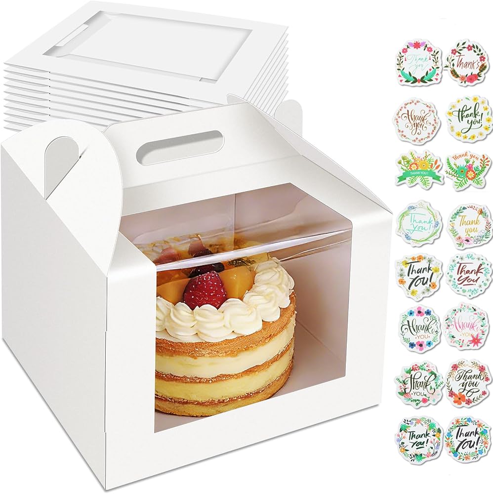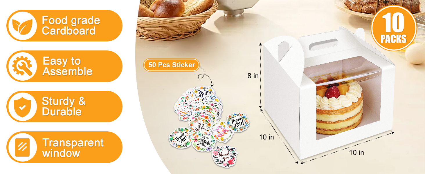 【10 قطع من علب الكيك 10 بوصة】 صندوق كيك مقاس 10x10x8 بوصة مصنوع من ورق مقوى صالح للطعام، بدون رائحة ومتين. 10 عبوات من صناديق الكعك مثالية لتغليف الكعك ذو الطبقات، والكعك المحطم، جيدًا للهدايا المخبوزة. تأتي مع 50 قطعة من الملصقات المطبوعة لتثبيت الجوانب لمزيد من القوة والحماية. وفي الوقت نفسه، اجعل تزيين صندوق الكيك الخاص بك أكثر تخصيصًا وإضافة جو احتفالي.