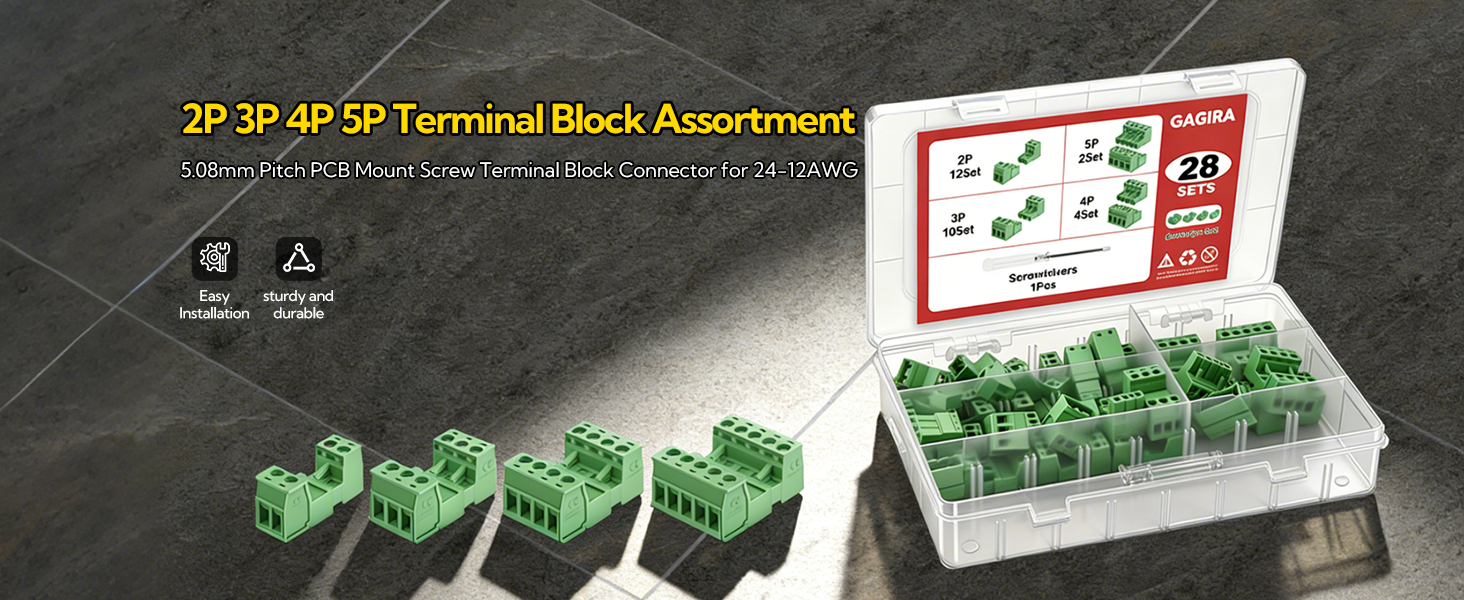 - Package Contents: 12 sets 2p terminal block; 10 sets 3p terminal block; 4 sets 4p terminal block; 2 sets 5p terminal block; 1 screwdriver, total: 28 sets