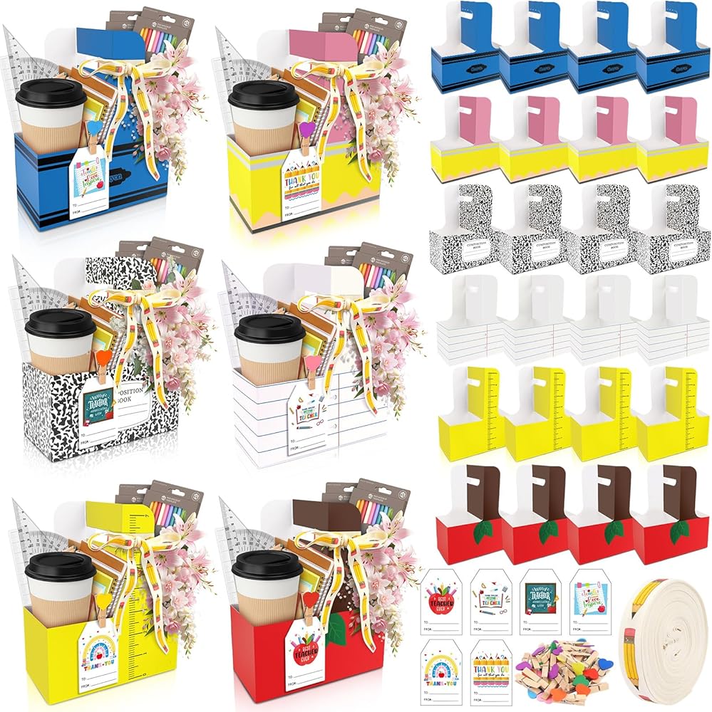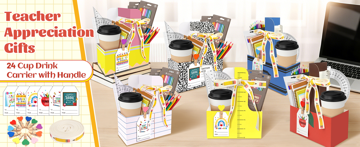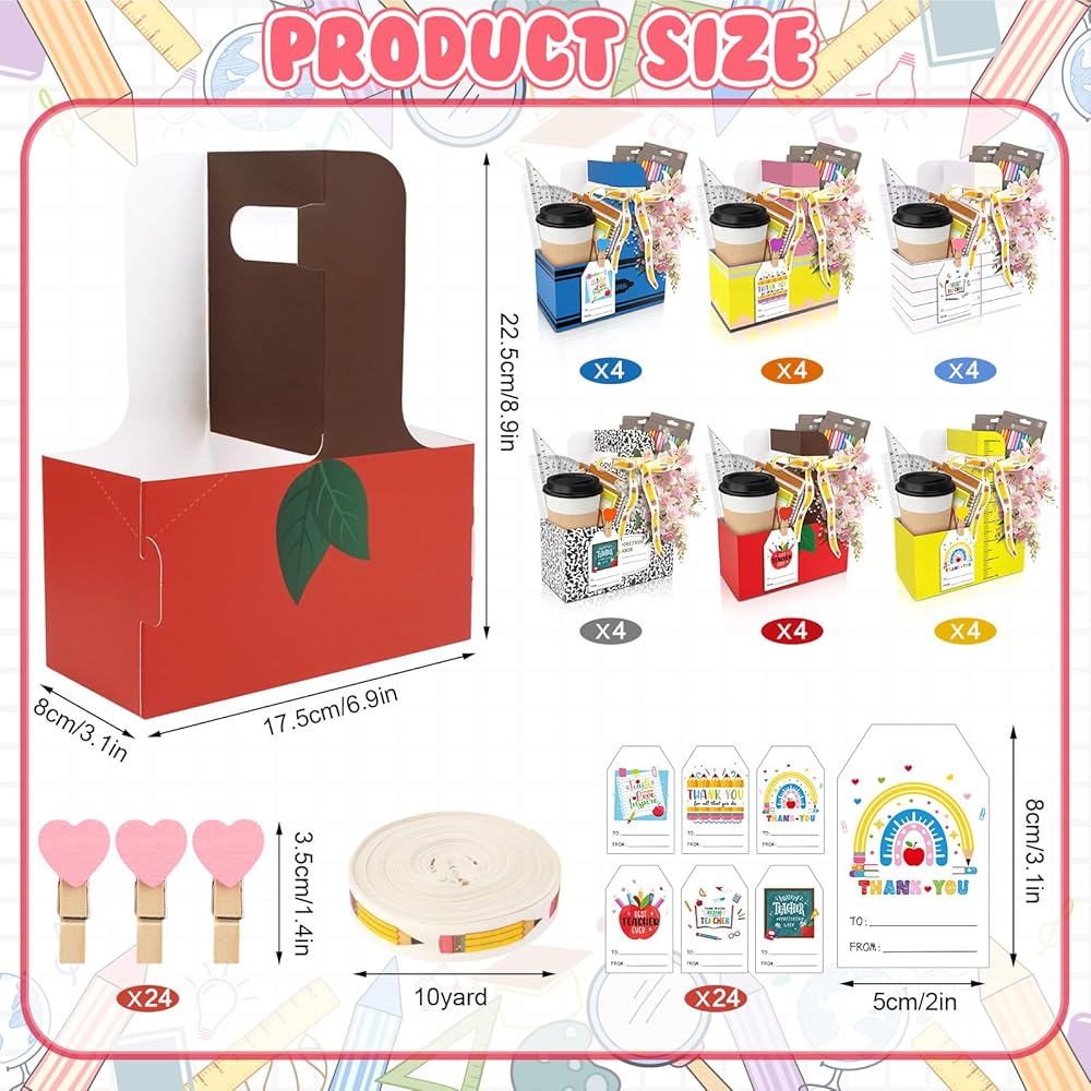 TREWAVE 24 مجموعة من هدايا تقدير المعلمين، 2 كوب حامل مشروبات بمقبض، حامل أكواب قهوة للاستعمال مرة واحدة مع بطاقات شكر ومشابك وشريط، مجموعة علبة من الورق المقوى مكونة من كوبين لمستلزمات حفلات التخرج