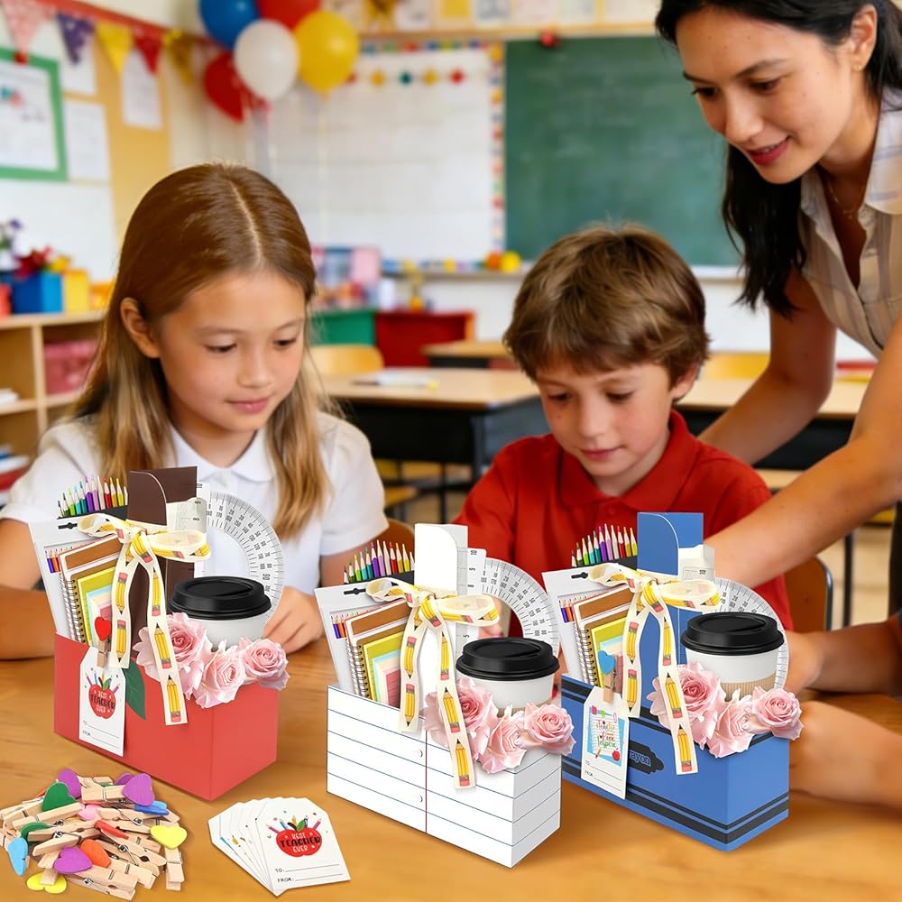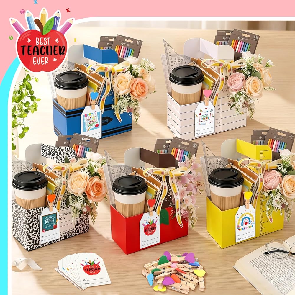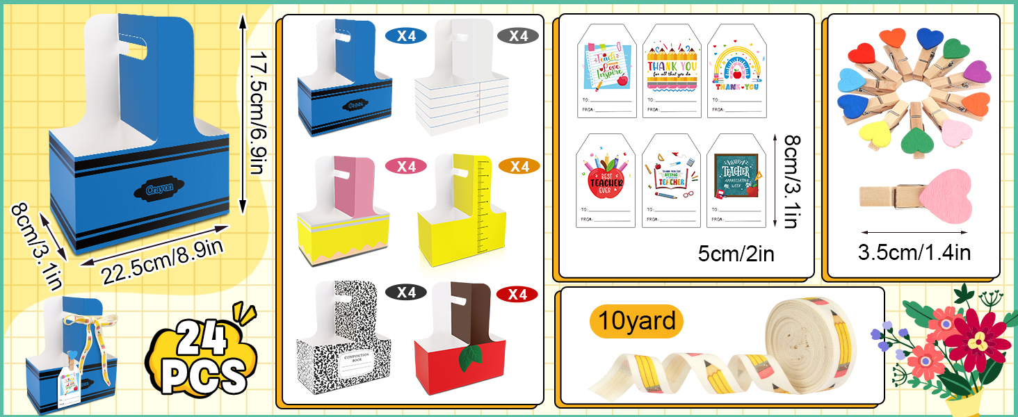 【مجموعة هدايا تقدير المعلم】 كل ما تحتاجه في عبوة واحدة. تشتمل مجموعة هدايا تقدير المعلمين هذه على 24 حامل مشروبات للاستعمال مرة واحدة مع مقابض، و24 مشبكًا خشبيًا على شكل قلب مختلط الألوان، و24 بطاقة تهنئة دافئة، ولفة من الشريط. تعتبر هدايا تقدير المعلمين هذه بكميات كبيرة مثالية لإظهار الامتنان للمعلمين أو المعلمين أو الموجهين دون متاعب شراء الملحقات بشكل منفصل.
