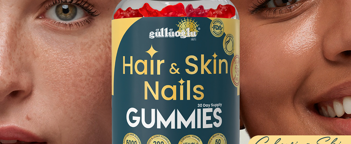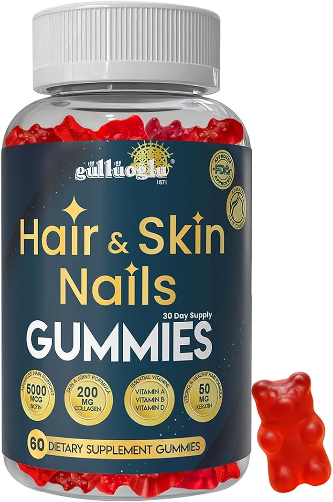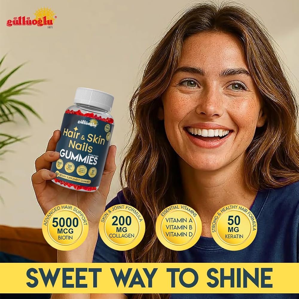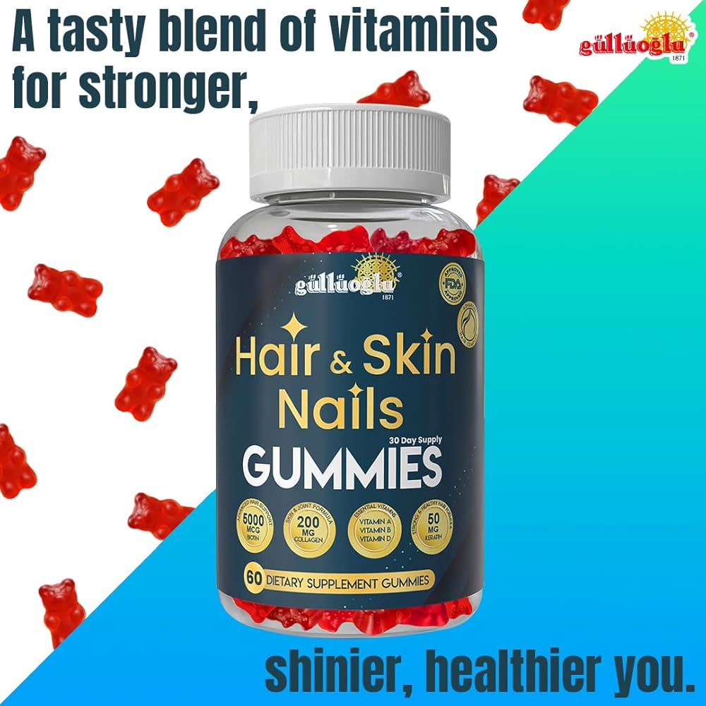 منذ 1871 GÜLLÜOGLU علكات الشعر والبشرة والأظافر - بيوتين 5000 ميكروجرام، كولاجين 200 مجم وكيراتين 50 مجم - مع MSM، الخيزران وفيتامينات A، C، D، E - خالية من الغلوتين، غير معدلة وراثيًا، 60 علكات التوت