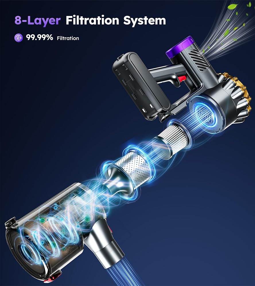 【ترشيح محكم الغلق على 8 مراحل، تنفس أسهل، حياة أكثر صحة】تتميز مكنسة الأرضية المصنوعة من الخشب الصلب بنظام ترشيح HEPA عالي الكفاءة مكون من 8 مراحل والذي يلتقط بشكل فعال 99.99% من جزيئات الغبار الدقيقة التي يصل حجمها إلى 0.2 ميكرون (PM 2.5)، مما يطلق الهواء النظيف. وهذا يخلق بيئة أكثر أمانًا لكبار السن والأطفال ومرضى الحساسية. كما تأتي المكنسة الكهربائية اللاسلكية مزودة بنظام تفريغ صحي بلمسة واحدة وكوب غبار كبير سعة 1.8 لتر مما يقلل الحاجة إلى التفريغ المتكرر أثناء التنظيف العميق في المنازل والشقق الكبيرة.
