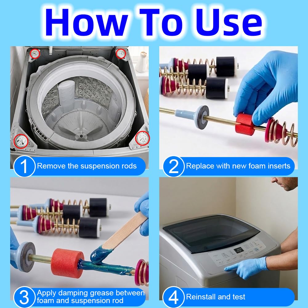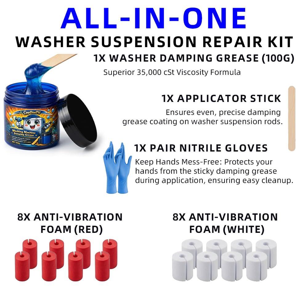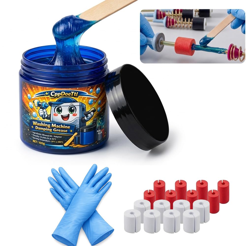 Stop the "Washer Dance" and Save Your Laundry Room Floor! Is your laundry day ruined by a thumping, vibrating washing machine? Most people think they need to buy a new washer or replace new suspension rods. The truth: the factory grease simply wore out. Our Damping Grease Repair Kit is the professional's secret to fixing unbalanced loads. The Science of Silence: Our 35,000 cSt grease creates the "drag" needed to slow down the suspension rods' movement. Combined with our upgraded EVA foam inserts, it creates a dual-layer dampening system that absorbs shocks before they reach the machine's frame. Everything Included: No need to hunt for tools. We provide the gloves to keep your hands clean and a spatula for precise application.
