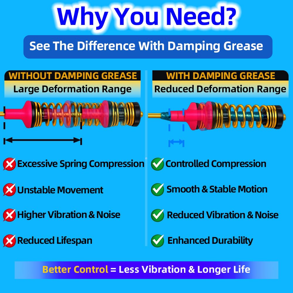 • 【Professional 35,000 cSt High-Viscosity Formula】 Featuring a heavy-duty viscosity of 35,000 cSt (measured at 104°F/40°C), our grease outperforms many factory lubricants. With an extreme temperature stability range of -4°F to 356°F (-20°C to +180°C), this silicone-based formula won't harden, melt, or leak over time. It provides consistent motion resistance to effectively suppress drum bounce and mechanical noise.