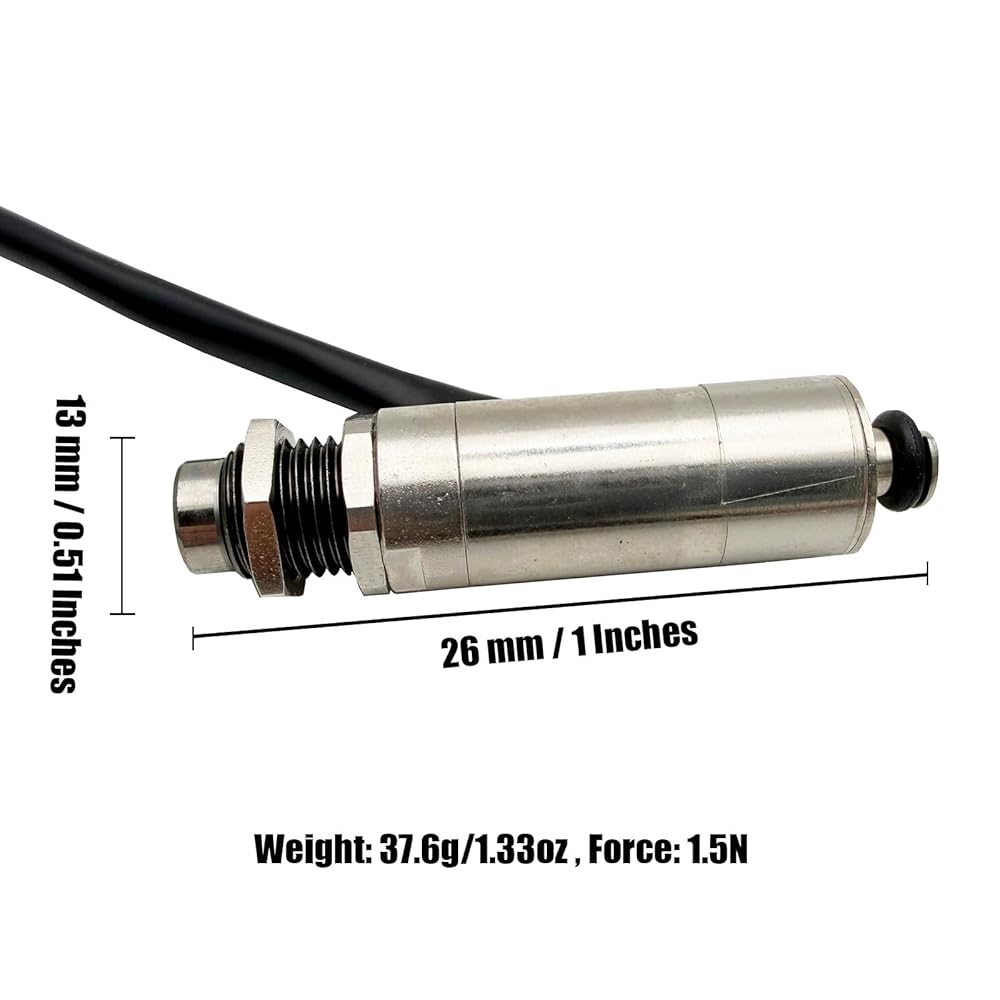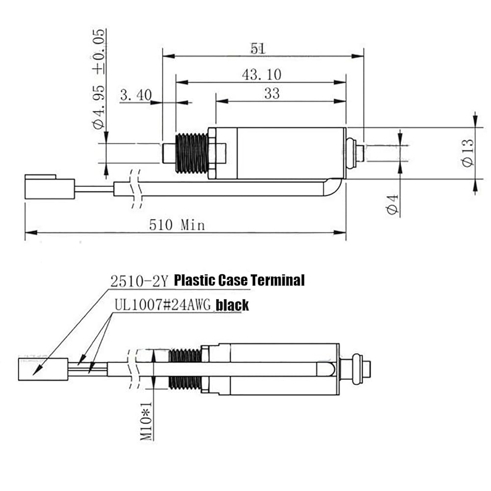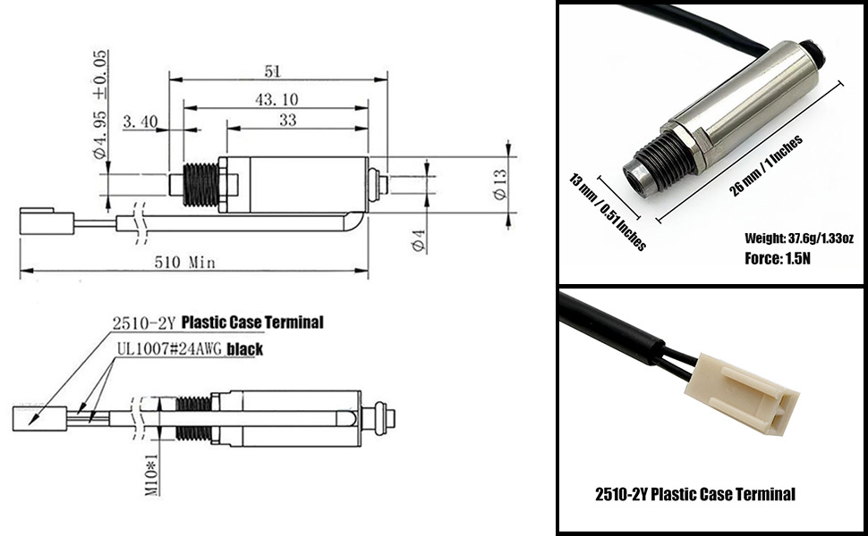 جهد العمل: DC24V، تيار العمل: 2 أمبير، الطاقة: 25 وات، الحجم: 13x26 مم/0.51 بوصة × 1 بوصة. طول الكابل: حوالي 55 سم/21.65 بوصة، مع طرف علبة بلاستيكي 2510-2Y. الوزن: 37.6 جم/1.33 أونصة، القوة: 1.5 نيوتن.