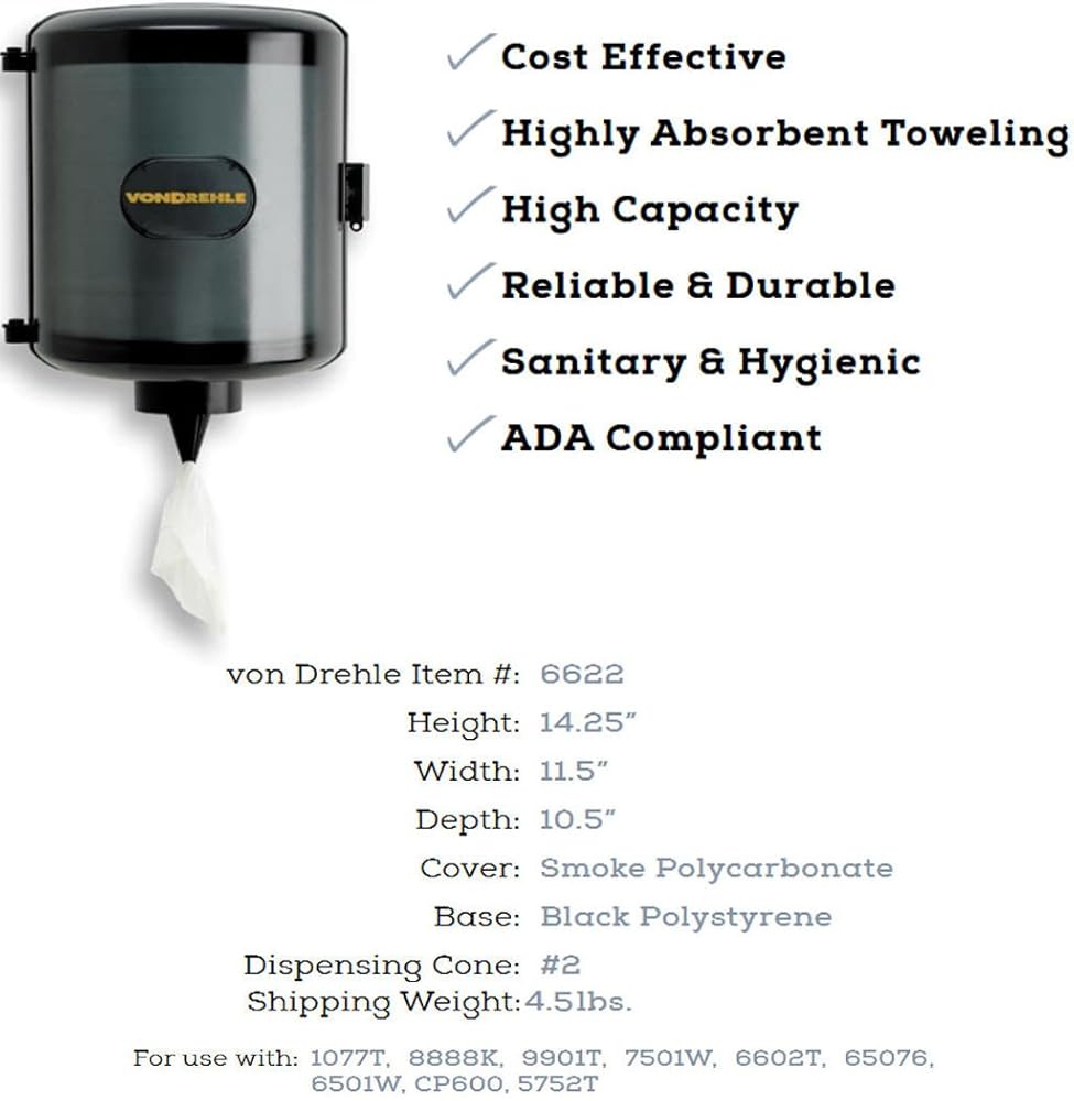vonDrehle 6622 High Capacity Centerpull Paper Towel Dispenser, Smoke Polycarbonate Cover, Black Polystyrene Base, High Capacity Up to 1000 Feet, Patented Dispensing Cone