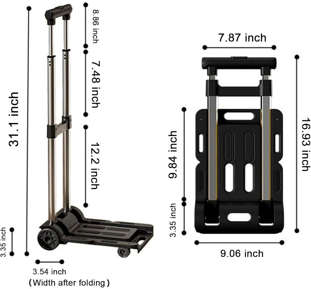 • 【مادة ممتازة】 العربة القابلة للطي مصنوعة من سبيكة معدنية، وعربة الأمتعة هذه أكثر متانة. عند حمل أشياء ثقيلة، يتم سحبها بسلاسة وليس من السهل هزها. يمكن طي هذه العربة القابلة للطي بسهولة في بضع ثوانٍ. إنها صغيرة الحجم ويمكن وضعها في السيارة أو تحت السرير أو في الخزانة أو في المرآب بعد طيها.