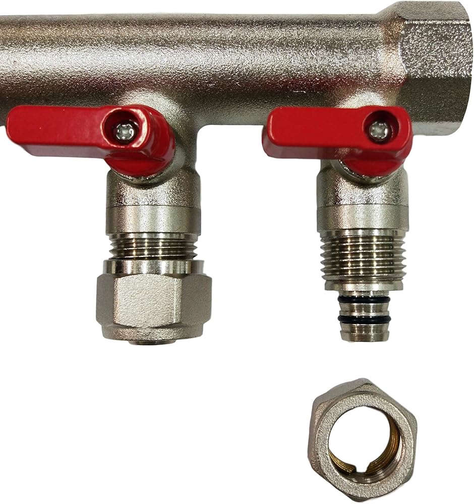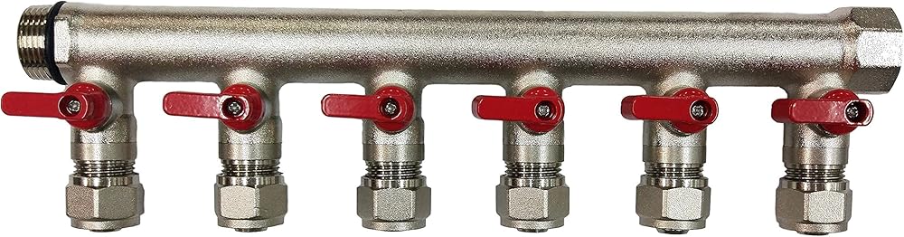 6 Loop Plumbing Manifold w/ 3/4" trunk & 1/2" pex ball valves, red handle