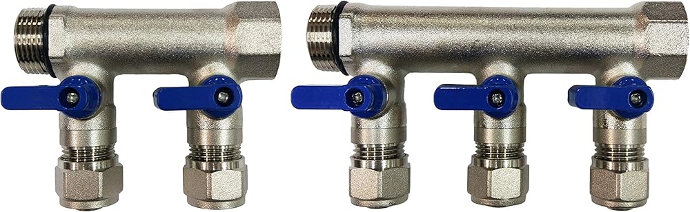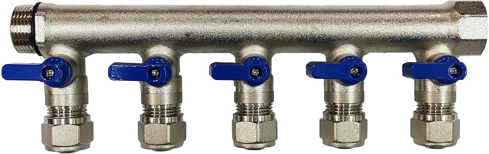 5 Loop Plumbing Manifold w/ 1" trunk & 1/2" pex ball valves, blue handle