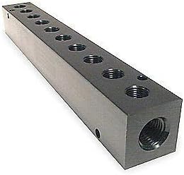 Manifold, Pipe Fitting Material Black Anodized Aluminum, Number of Inlets 2, Number of Outlets 10, Inlet Size 1/4 In., Outlet Size 1/8 In., Overall Length 7-3/4 In., Overall Width 1 In., Overall Height 1 In., Fitting Connection Type NPT, Max. Pressure 1000 psi, Mounting Hole Size 0.17 In., Temp. Range -10 Degrees to 200 Degrees F