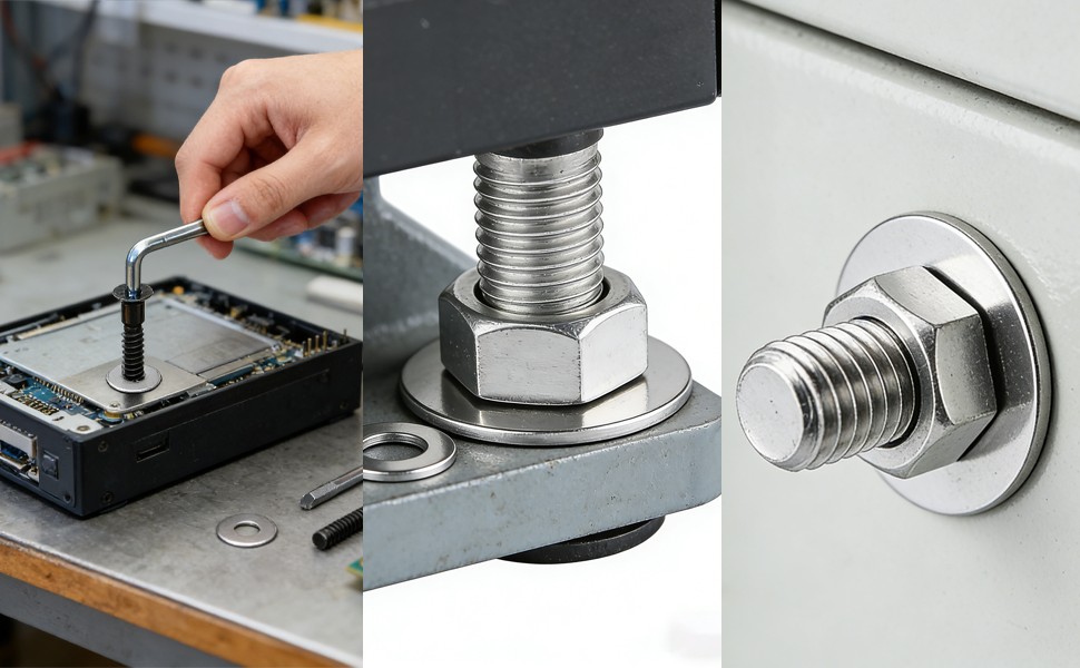 • تطبيقات واسعة: تُستخدم هذه الغسالات العادية كعناصر مانعة للتسرب بين مكونين متصلين (مثل الفلنجات والمفاصل الملولبة) لملء التفاوت الصغير بين الأسطح المتصلة. إنها تخضع للتشوه البلاستيكي تحت قوة الشد المسبق للمسامير، وبالتالي تحقيق الختم، منع التسرب، تعويض الفجوة، امتصاص الصدمات، وغيرها من الوظائف، وتوزيع حمل المثبتات مع تقليل الحرارة والاحتكاك أثناء عملية الشد.