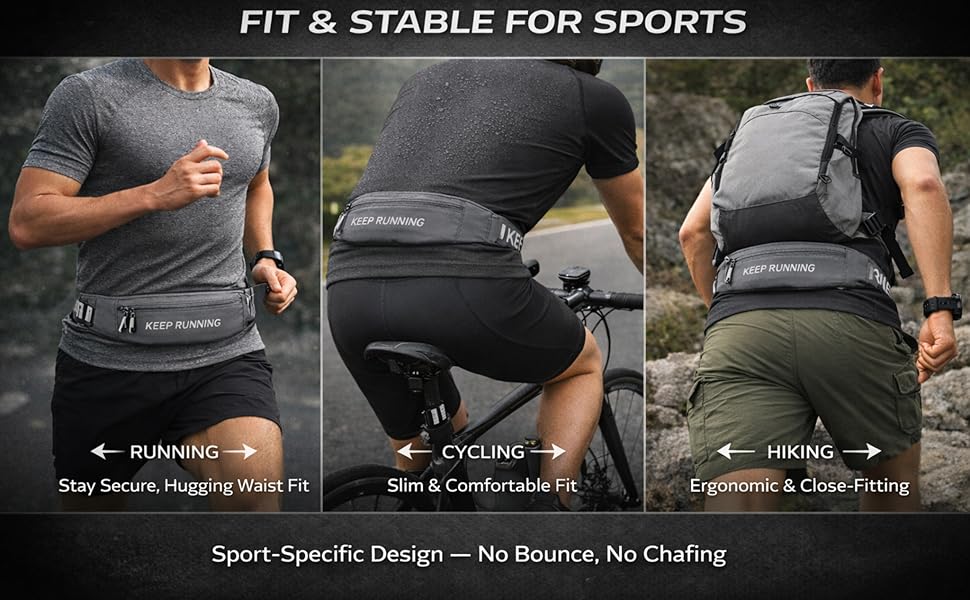 【NO BOUNCE & SECURE FIT FOR ACTIVE SPORTS】This running belt waist pack is designed with an ergonomic, low-profile structure that stays firmly in place. The soft elastic waistband fits snugly around your body to prevent bouncing, slipping, or riding up during movement. Ideal as a bounce free running belt for running, jogging, cycling, and hiking, allowing you to stay focused on your workout without distractions.
