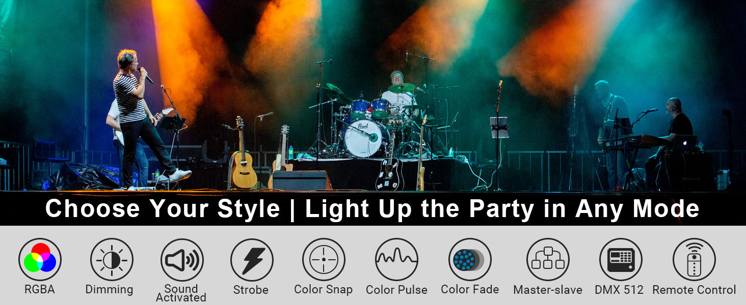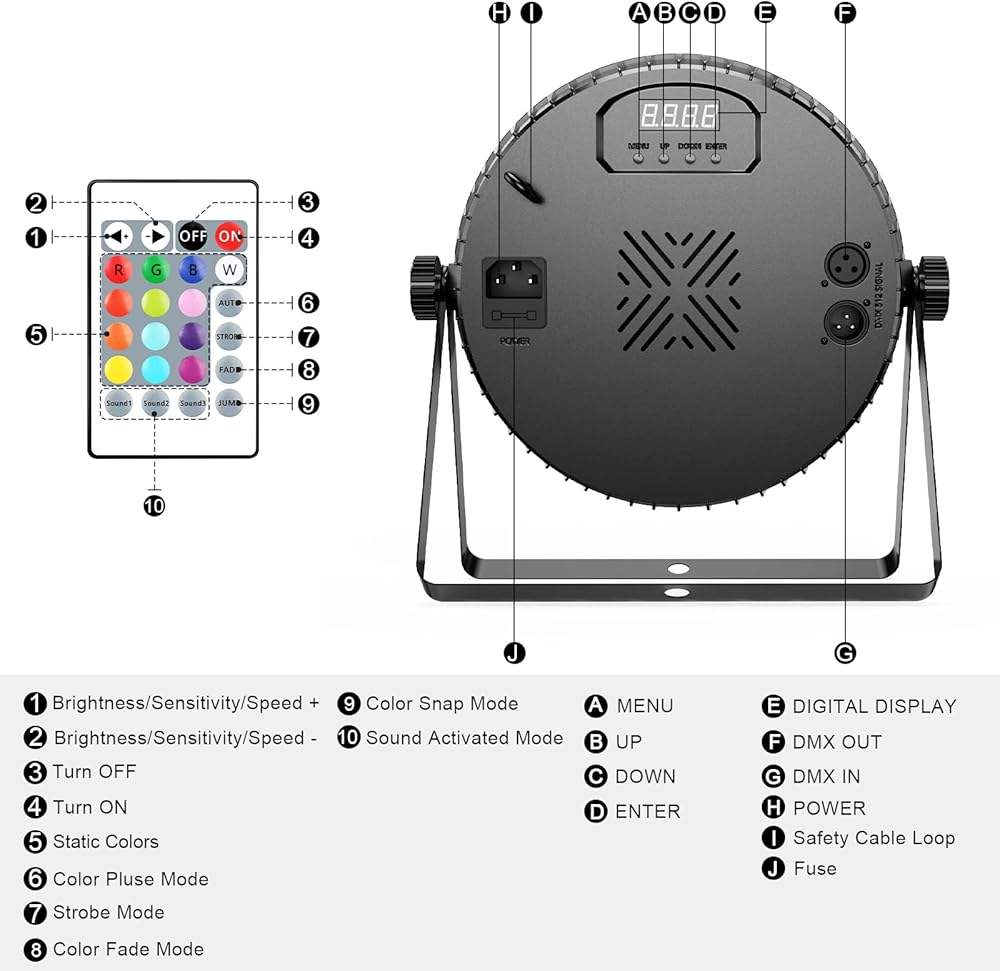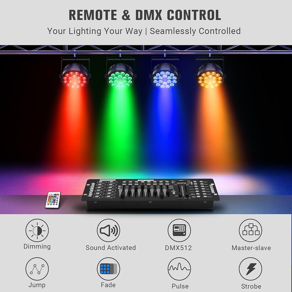 تحكم مرن مع جهاز التحكم عن بعد وDMX Par Light - يمكنك التبديل بسهولة بين الأوضاع باستخدام جهاز التحكم عن بعد المتضمن أو جهاز التحكم DMX512 ذو 4/8 قناة، مما يمنحك القدرة على التحكم في التقاط الألوان، والبهتان، والنبض، والمؤثرات الصوتية. رائعة لكل من الإعدادات الاحترافية ومستخدمي الحفلات المنزلية.