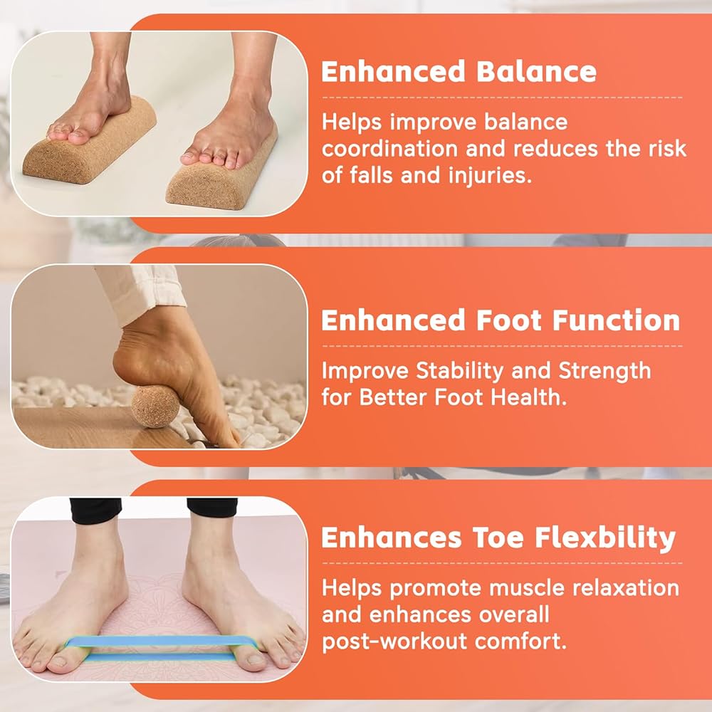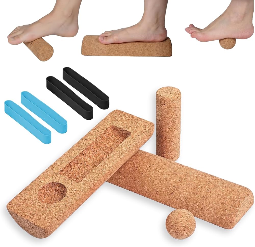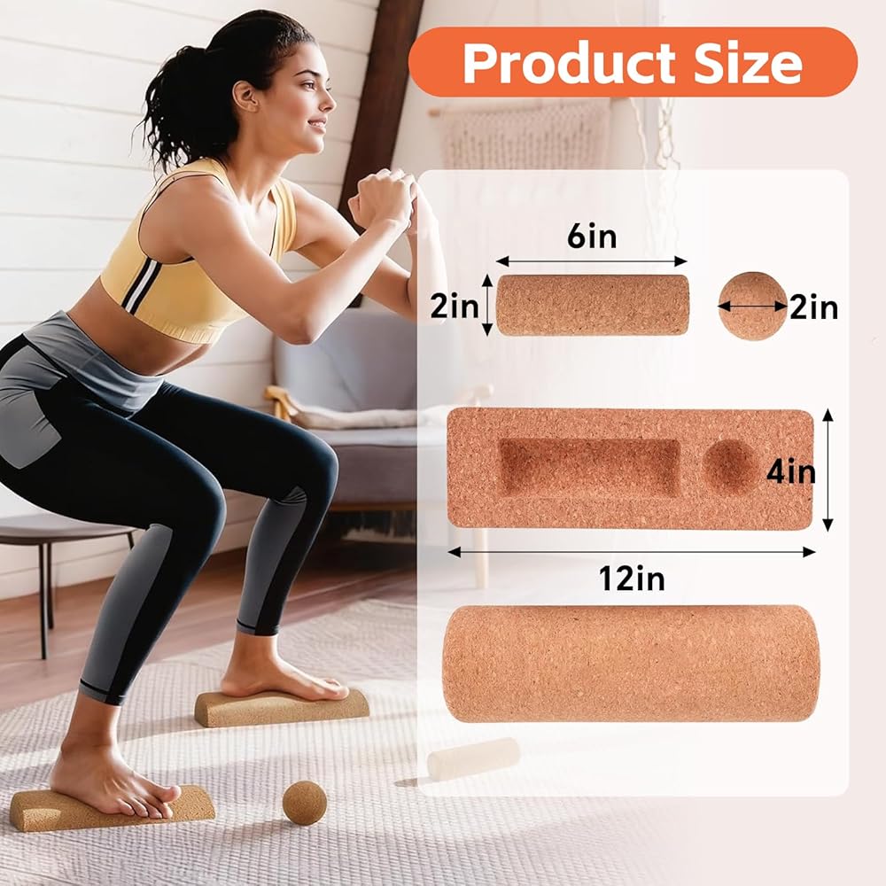 مجموعة تدريب تقوية وتوازن القدم من الفلين - نظام حركة القدم 4 في 1 مع الأسطوانة وكرة التدليك وأشرطة أصابع القدم | تحسين الاستقرار، وإصلاح الإفراط في الكب، وتعزيز التوازن واستعادة وظيفة القدم الطبيعية