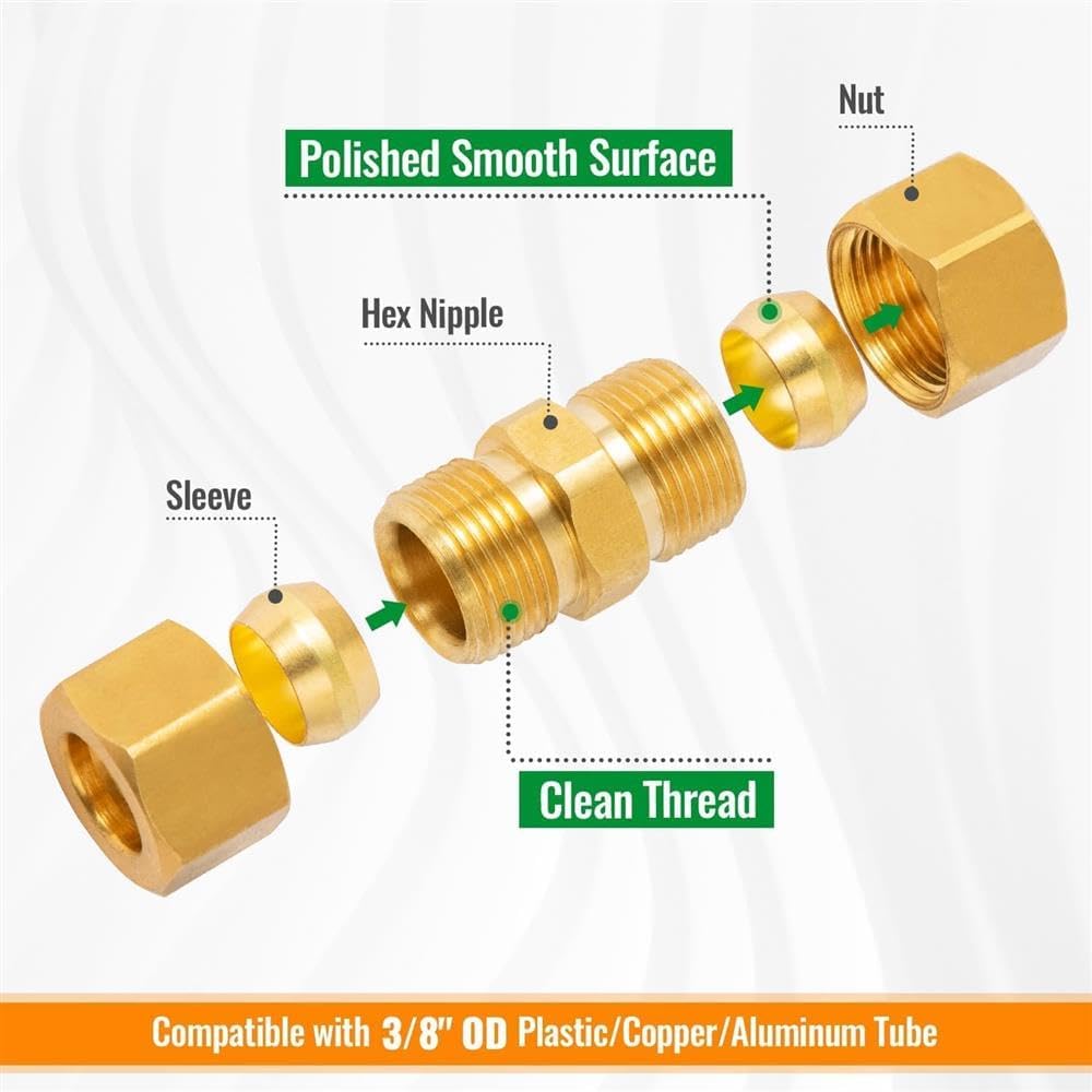 • 6-Pack 3/8 Inch Brass Compression Tube Fittings 3/8" x 3/8" OD Compression Union Straight Coupling Adapter with a Sealing Tape