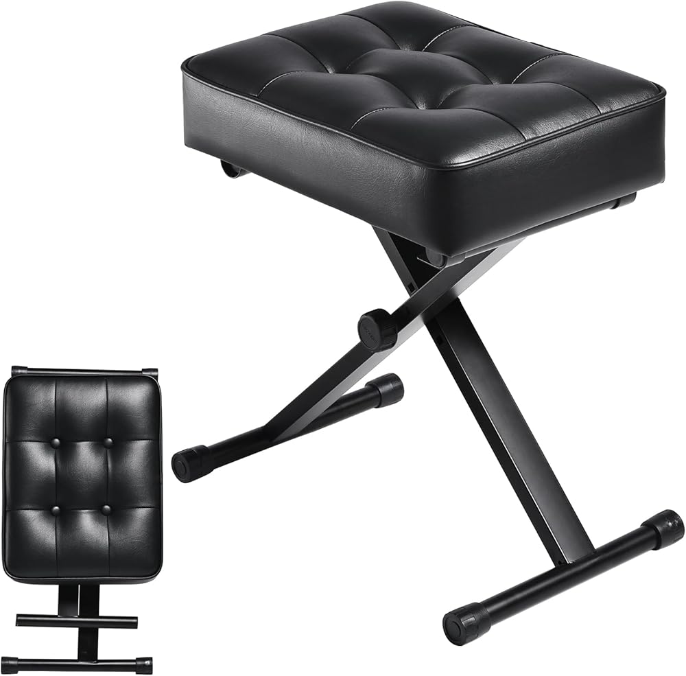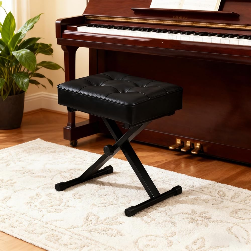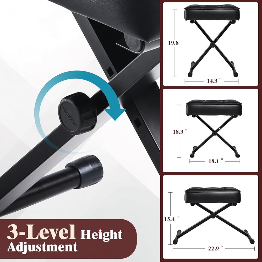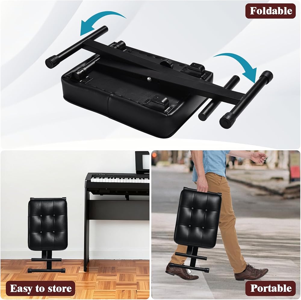 مقعد لوحة مفاتيح بيانو قابل للتعديل - مقعد لوحة مفاتيح قابل للطي مع أقدام مضادة للانزلاق، ارتفاع 3 مستويات مناسب للبالغين والأطفال، تصميم أزرار كلاسيكي، وسادة جلدية PU ممتازة، مقعد بيانو محمول (أسود)
