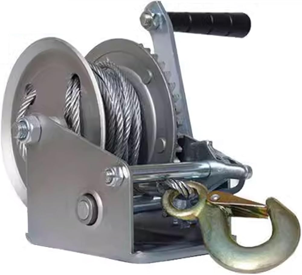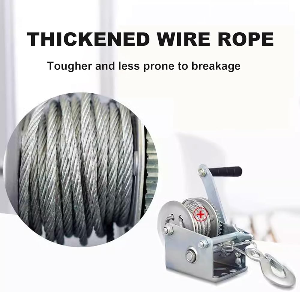 • EASY PULLING: Say goodbye to fiddly pulling! 26 ft. long x 4 mm wide marine winch straps with hooks are constructed of galvanized steel wire rope to provide reliable and safe pulling. The ergonomic crank handle is easy to turn, reducing hand fatigue and increasing overall efficiency, Its non-slip design ensures safety during use.