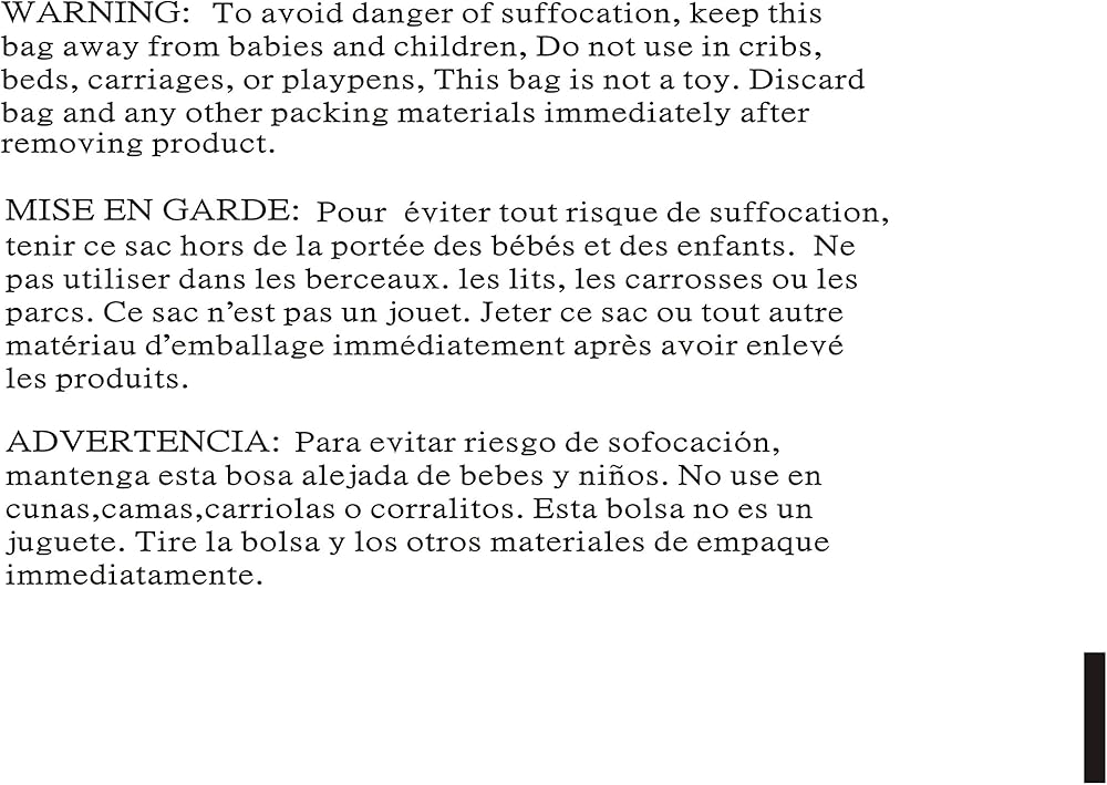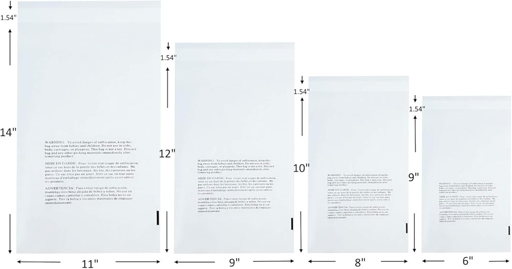 Each bag features a strong self-adhesive seal, allowing for quick and secure closure without the need for heat sealers. The bags are FBA compliant, making them an excellent choice for Amazon sellers. The suffocation warning is printed in English, Spanish, and French, ensuring safety and compliance with international standards.