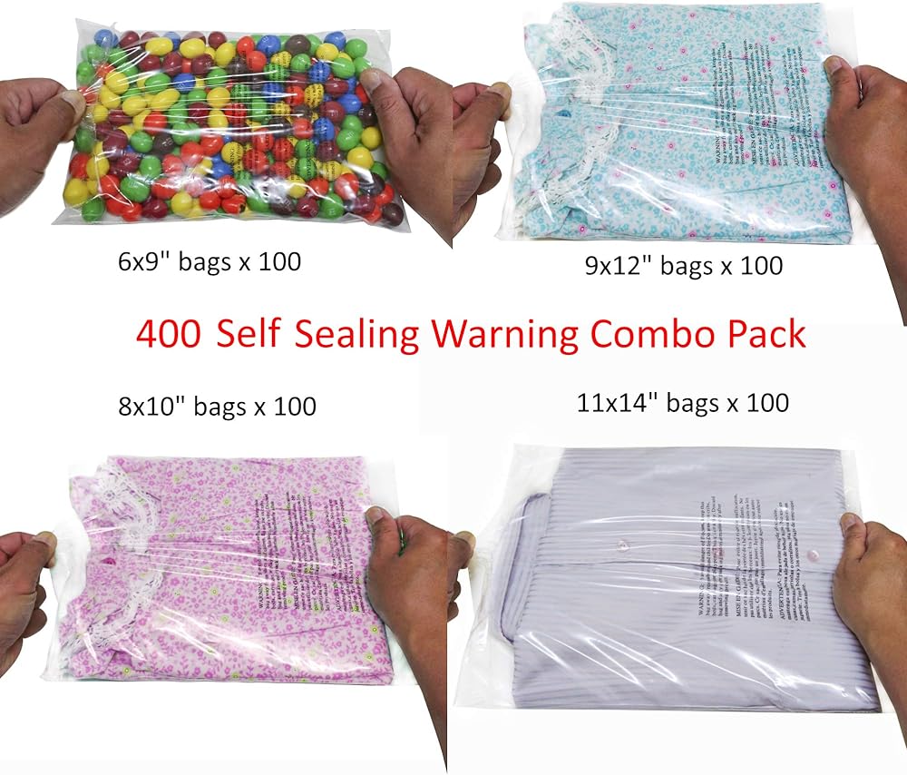 The Wowfit 400 CT Combo Pack offers a versatile and reliable solution for all your packaging needs. This set includes four different sizes of transparent poly bags: 6x9, 8x10, 9x12, and 11x14 inches, with 100 bags of each size. Made from high-quality polyethylene, these bags are 1.5 mil thick, ensuring durability and protection for your items.