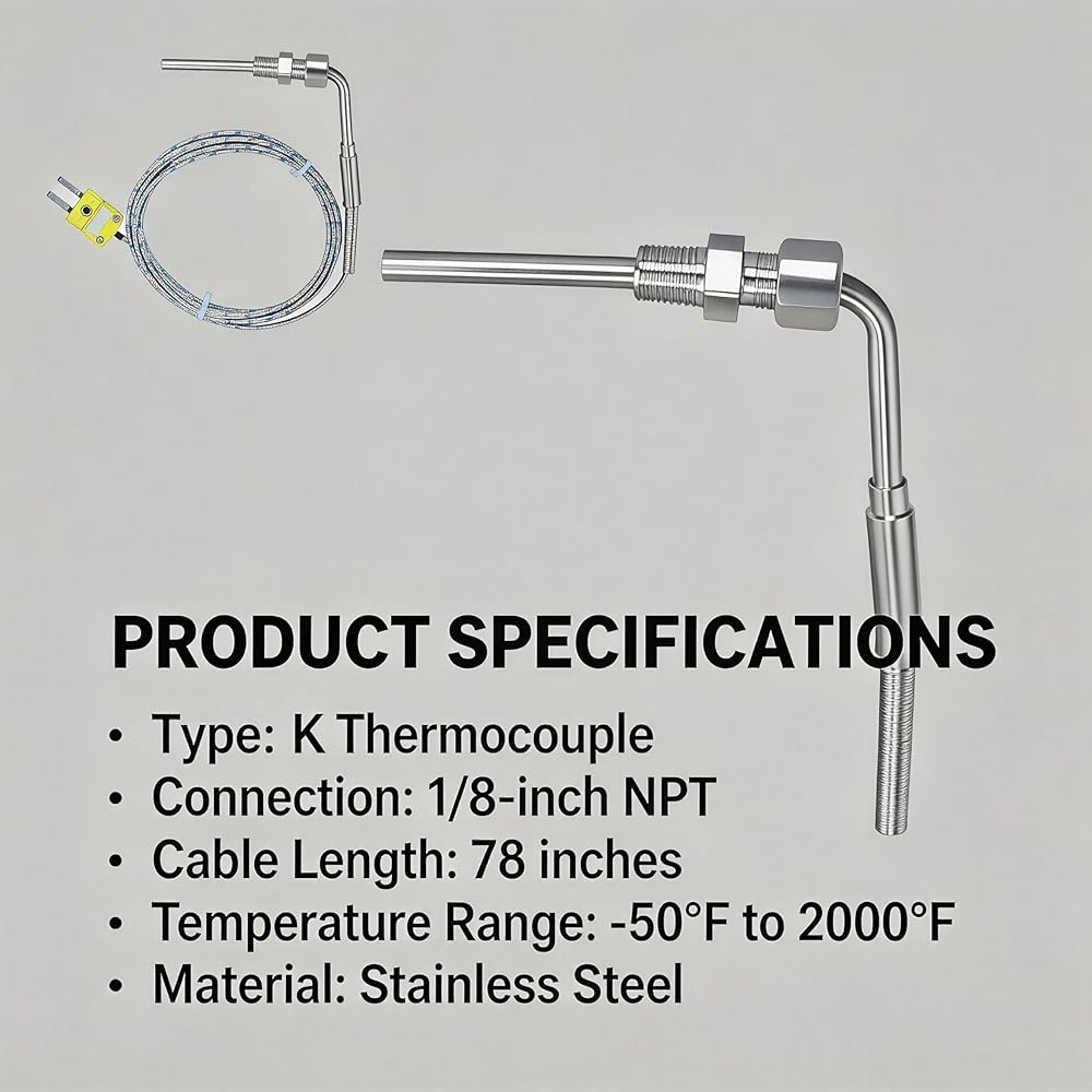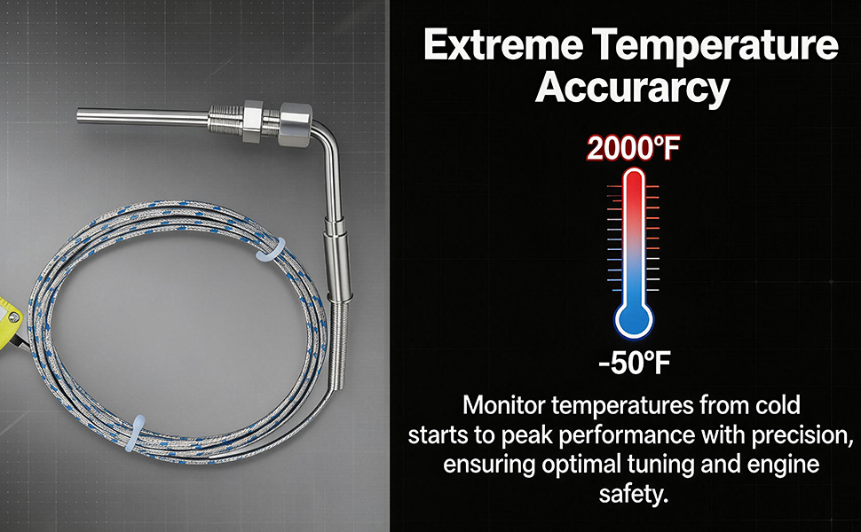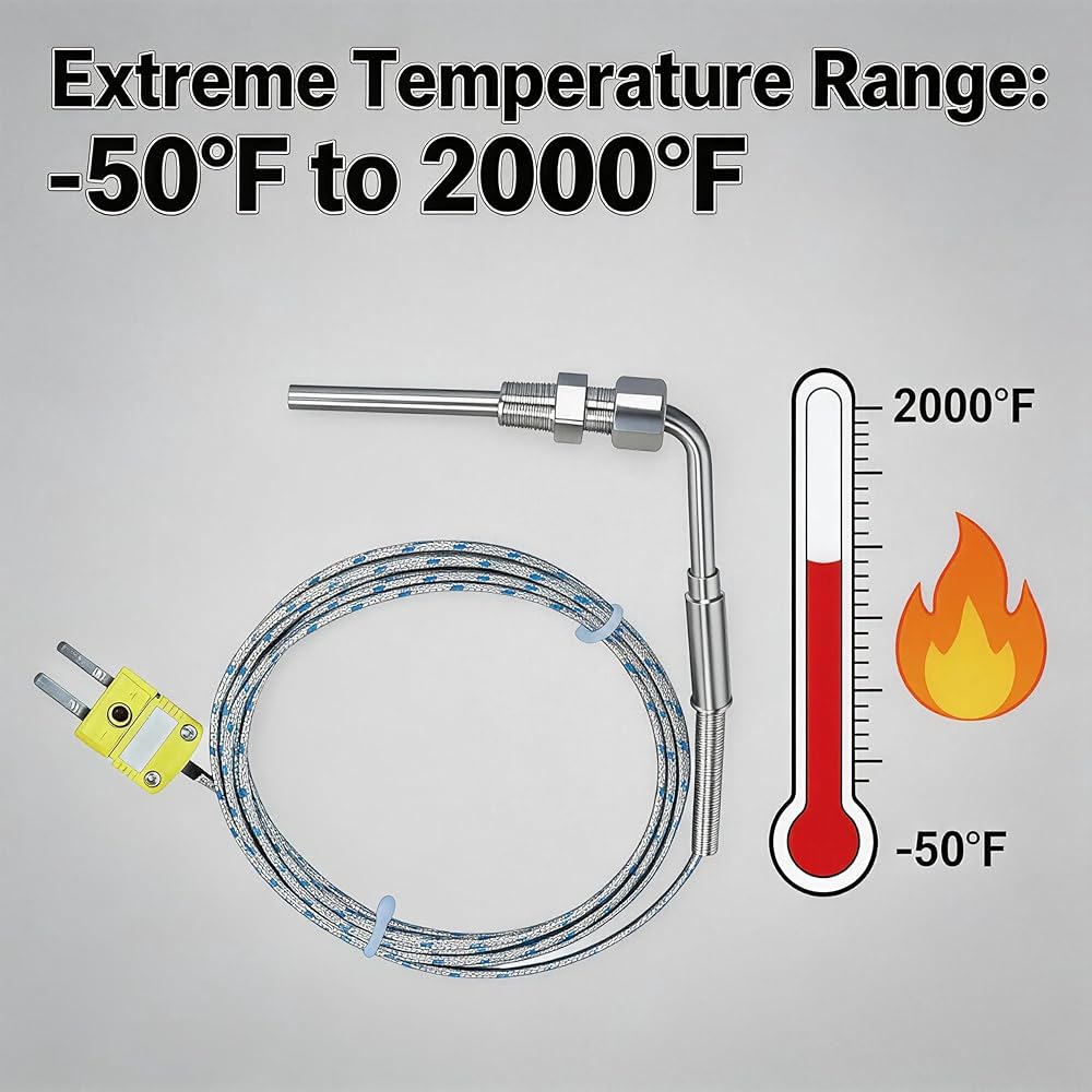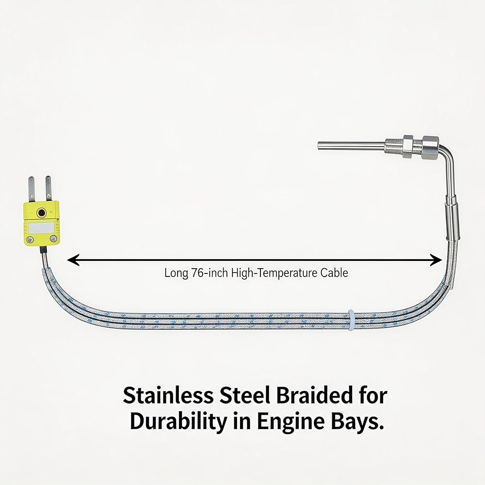 مسبار حراري مزدوج لدرجة حرارة العادم من النوع K، مستشعر درجة حرارة العادم مقاس 1/8 بوصة NPT | كابل 76 بوصة، نطاق -50 درجة فهرنهايت إلى 2000 درجة فهرنهايت | مناسب لتطبيقات الشاحن التوربيني وضبط الأداء البحري