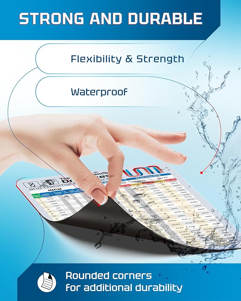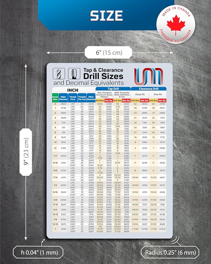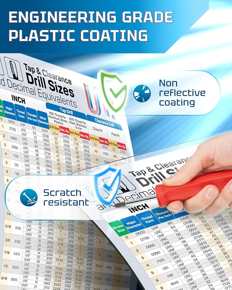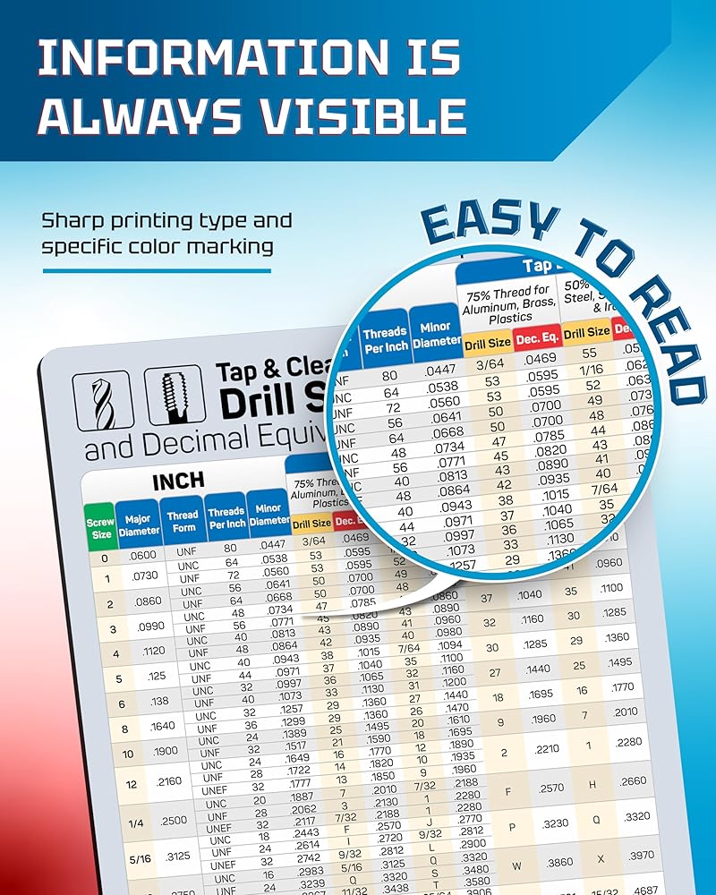 ★【𝐂𝐎𝐌𝐏𝐑𝐄𝐇𝐄𝐍𝐒𝐈𝐕𝐄 𝐒𝐈𝐙𝐄 𝐑𝐀𝐍𝐆𝐄】– Covers tap and clearance decimal equivalents from 0-80 to 1-20, including UNC, UNF, and UNEF threads. All essential measurements in one place for accurate machining and drilling with reduced errors.
