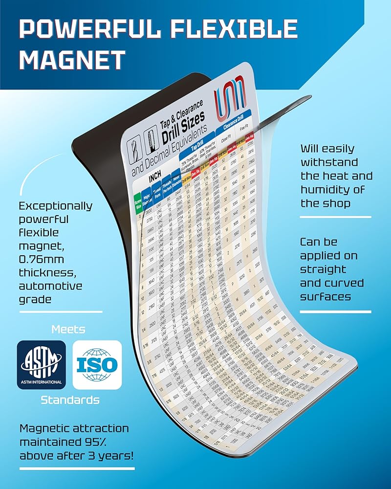 This guide meets the precision needs of machining and engineering tasks, featuring a wide range of tap and clearance drill sizes with precise decimal equivalents. Flexible magnetic chart ensures accuracy and compatibility for effective communication in diverse applications.