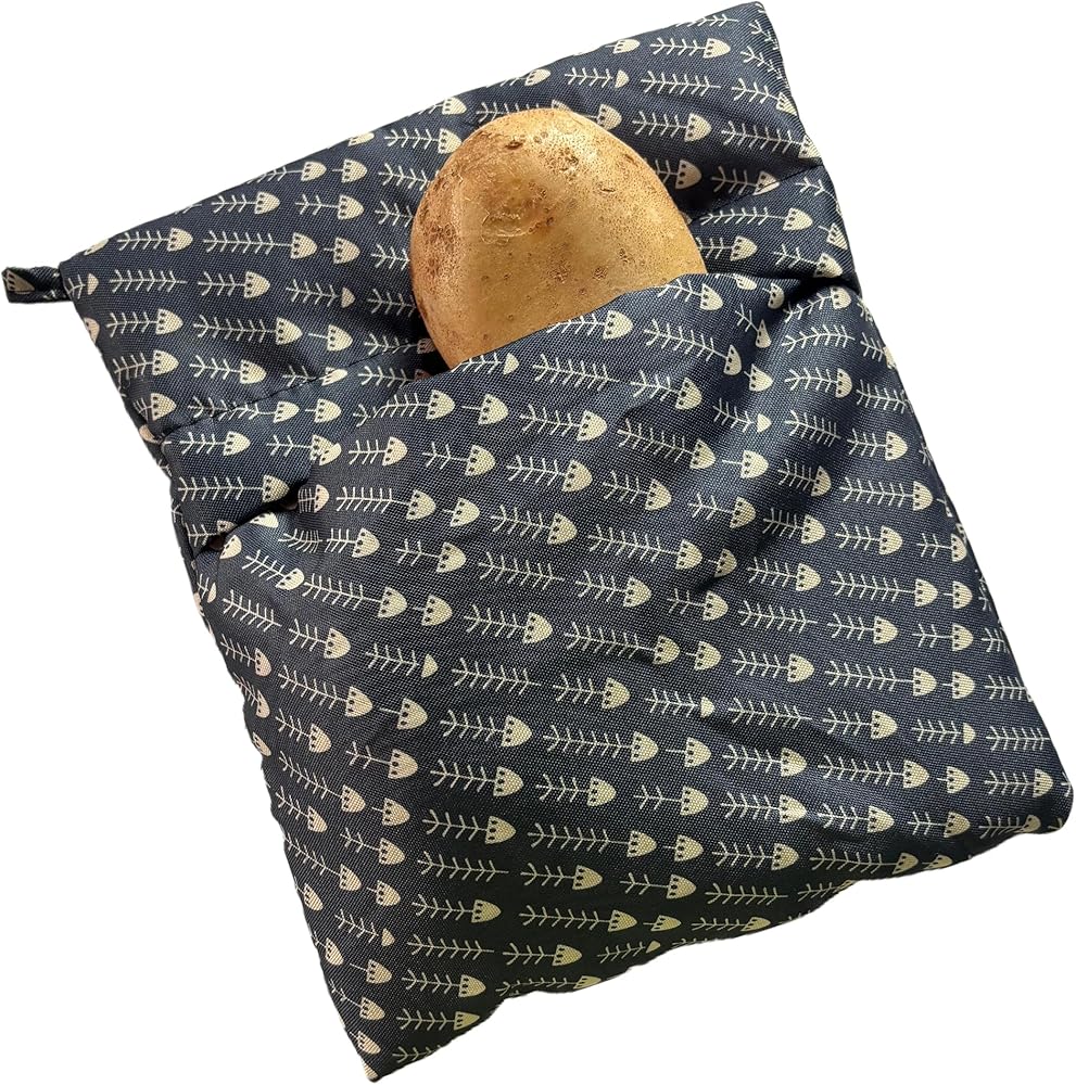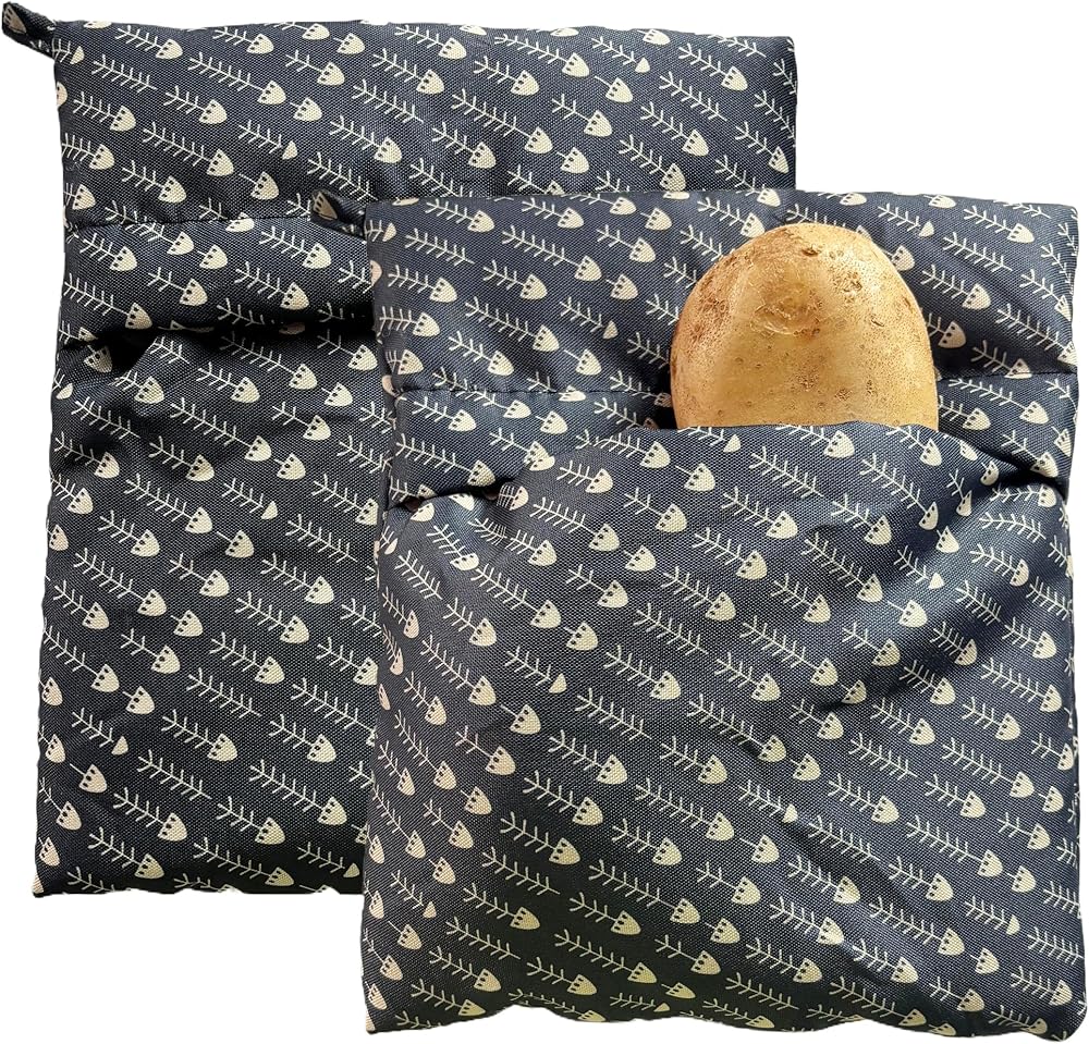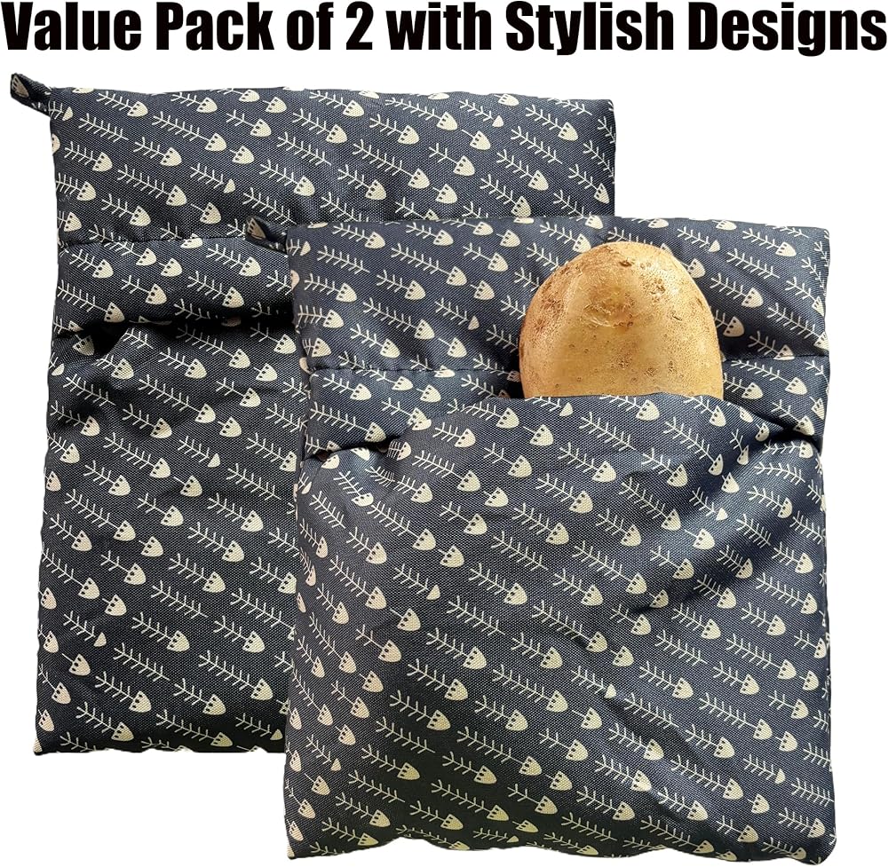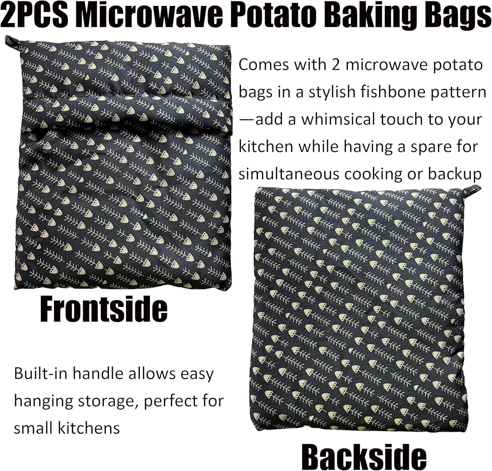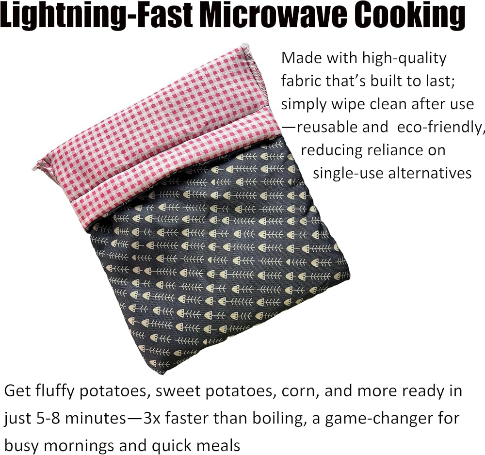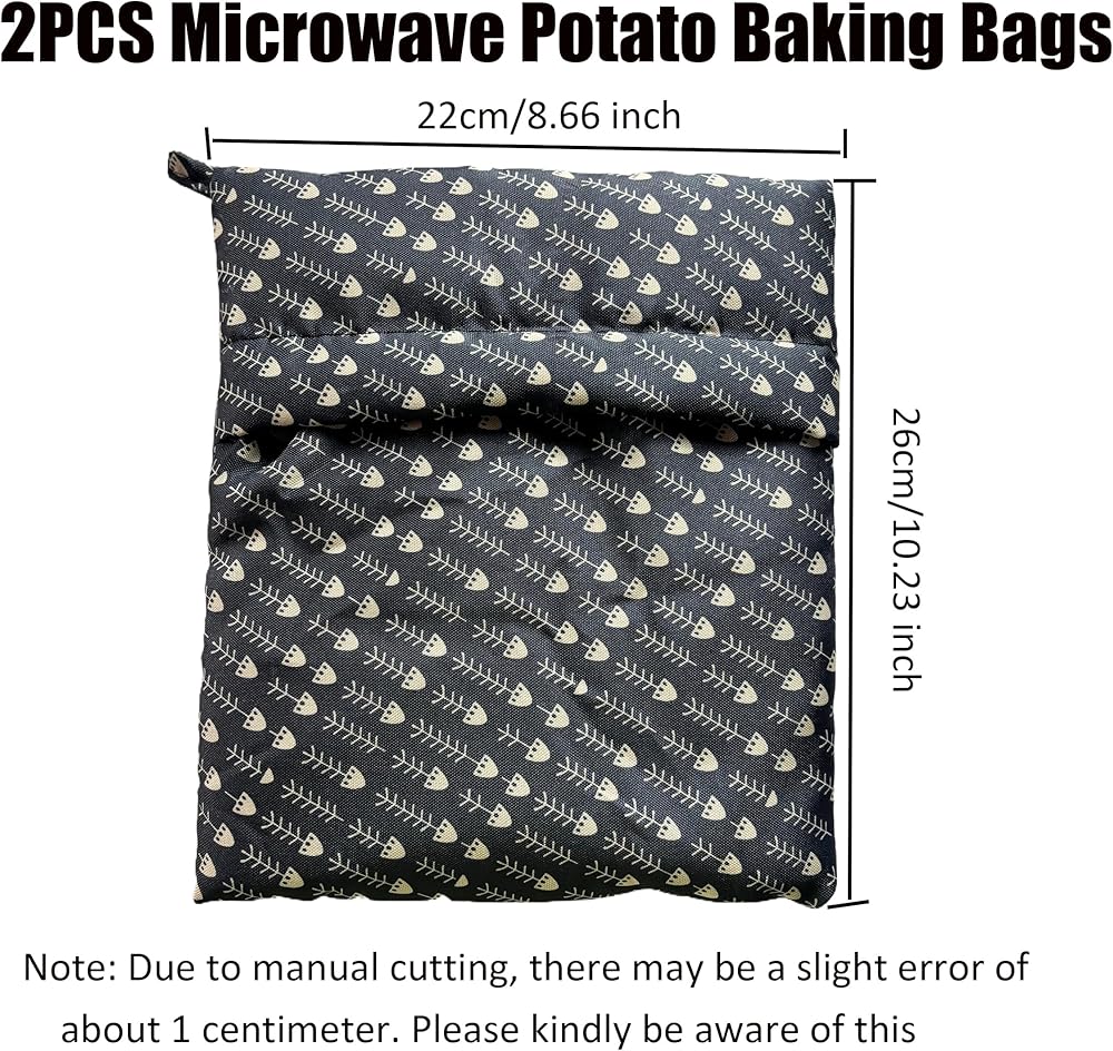 Transform your microwave cooking routine with this 2-pack of reusable potato baking bags. Each bag measures 22cm/8.66 inches by 26cm/10.23 inches and features an elegant fishbone pattern design that adds style to functionality. Perfect for preparing fluffy potatoes, sweet potatoes, corn, and other vegetables in just 5-8 minutes - that's three times faster than traditional boiling methods. The bags come with convenient built-in handles for easy storage, making them ideal for small kitchens. Made with high-quality, durable fabric that's simple to clean - just wipe after use. Having two bags allows for simultaneous cooking or ensures you always have a backup ready. These bags are practical time-savers for busy mornings and quick meals. Please note there may be a slight size variation of about 1 centimeter due to manual cutting. The whimsical pattern brings a charming touch to your kitchen while serving as an efficient cooking tool. Save time and energy while achieving perfectly cooked potatoes and vegetables with these versatile microwave bags.
