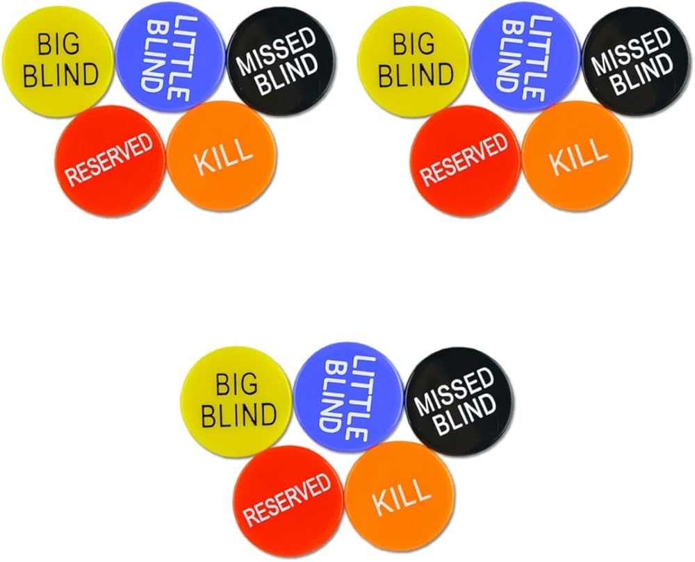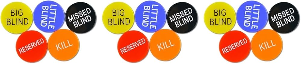 3 x Little Blind 3 x Big Blind 3 x Missed Bling 3 x Poker Buttons 3 x Reserved Poker Buttons